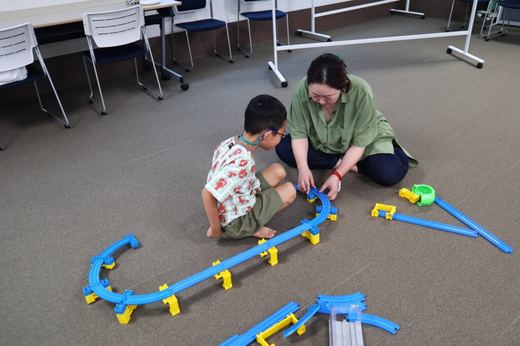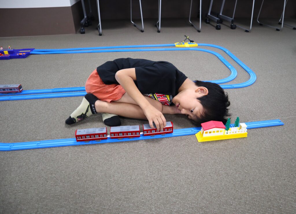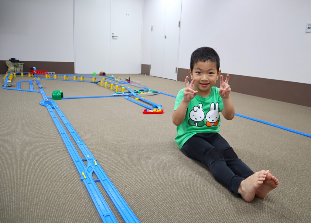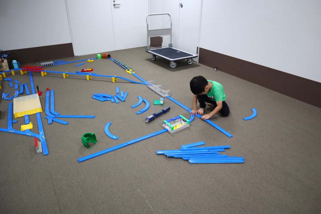 ラポール上大岡8階の多目的室の広い空間を使って、自由にプラレールを組み立てて2時間思いっきり遊べます。