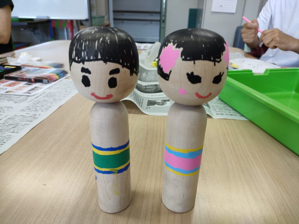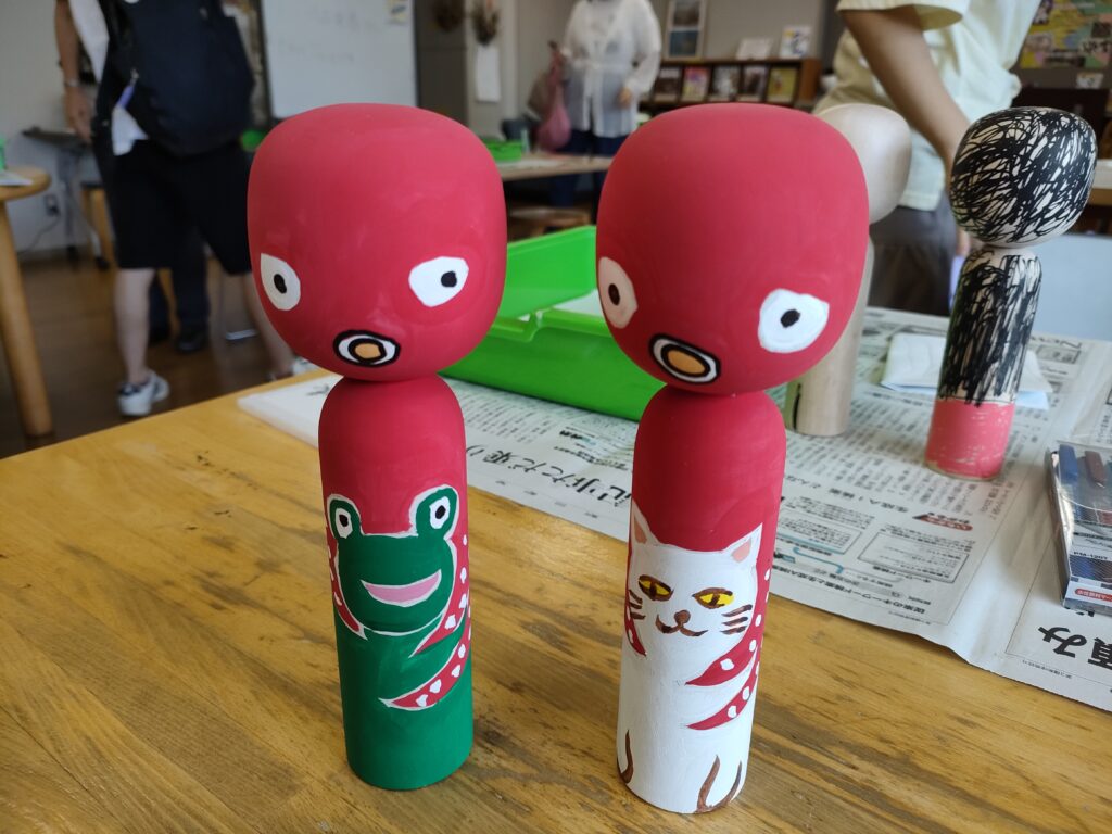 こけしは1人2本製作しました。こけしを「人」に見立てペイントする方、動物に見立てる方、見ていてとても楽しいアート作品になりました。
