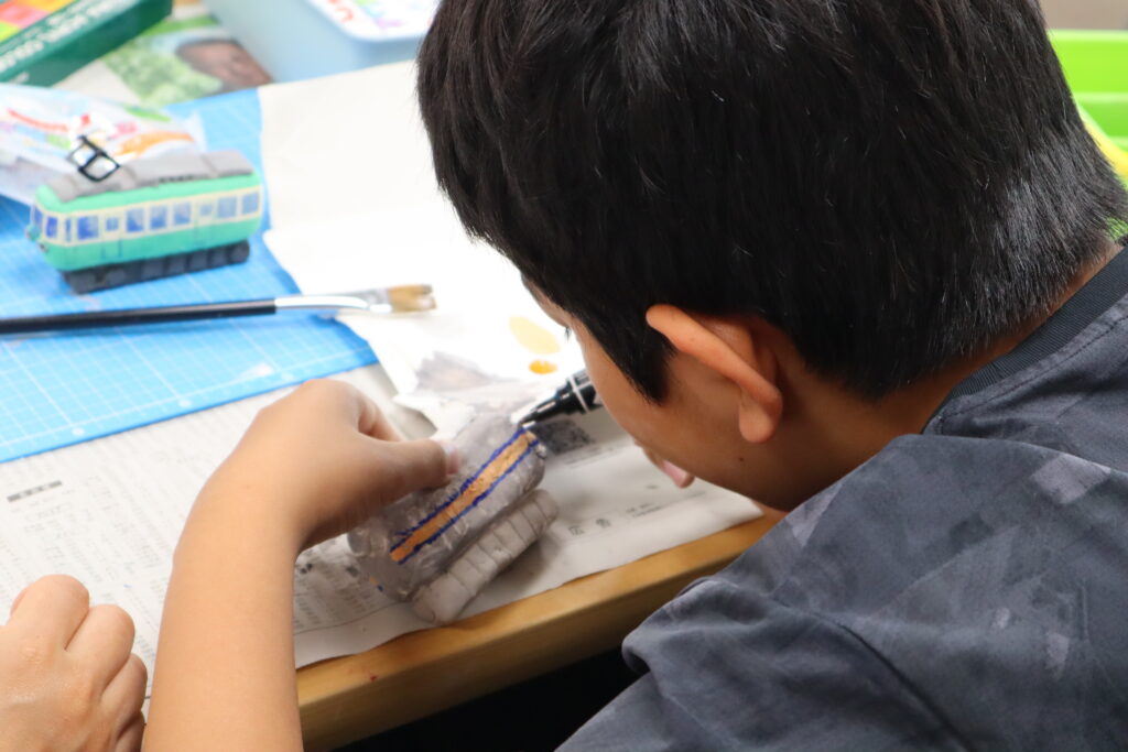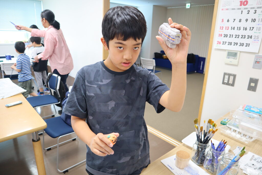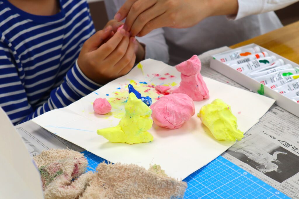 形が出来上がったら、アクリル絵の具で色塗りです♪最初から紙粘土に絵の具を混ぜて作る方法もあります!皆さん好きな方法で自由に作っていきます!