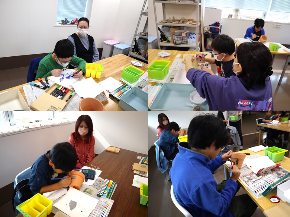 抽選で選ばれた参加者は、大きい植木鉢か小さい植木鉢を選び、下書きをしたり、直接植木鉢に絵を描き出しました。