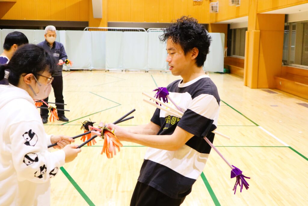 フラワースティックとは、両端に花のようなフリンジがついた細長いスティックを、特大の箸(!)のような2本の棒で交互に叩きながら宙に浮かす…という、言葉で表すとなかなか難しいのですが、アクロバットで華やかなパフォーマンスです。上手になってくると、片手だけでスティックを永遠に回転させ続けることもできます!