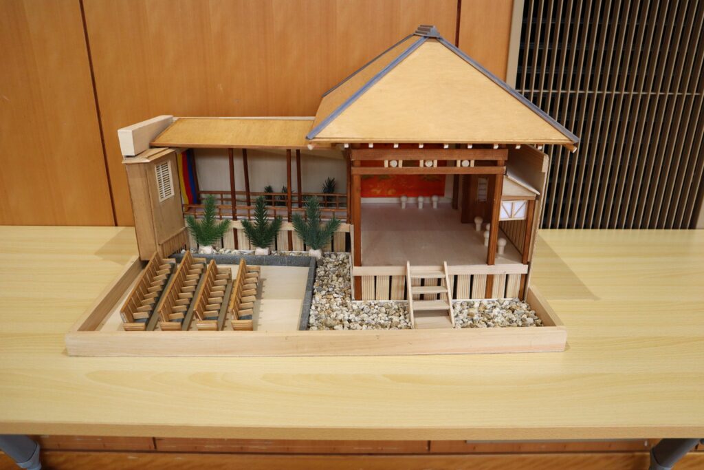 日本の伝統芸能である能は、普段あまり触れる機会が無いと思いますが、今回、能舞台の模型や能の衣装、楽器を体育室に用意してもらいました。