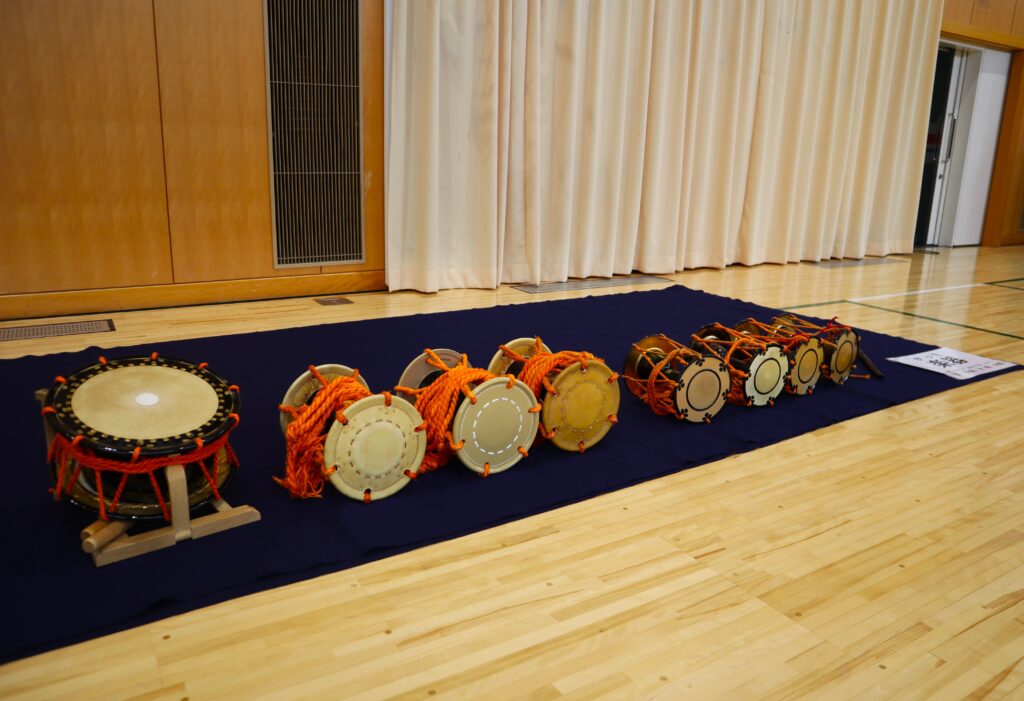 小鼓(こつづみ)と大鼓(おおつづみ)は馬の皮が張られているそうで、太鼓は牛の皮と真ん中には鹿の皮が用いられているそうです。