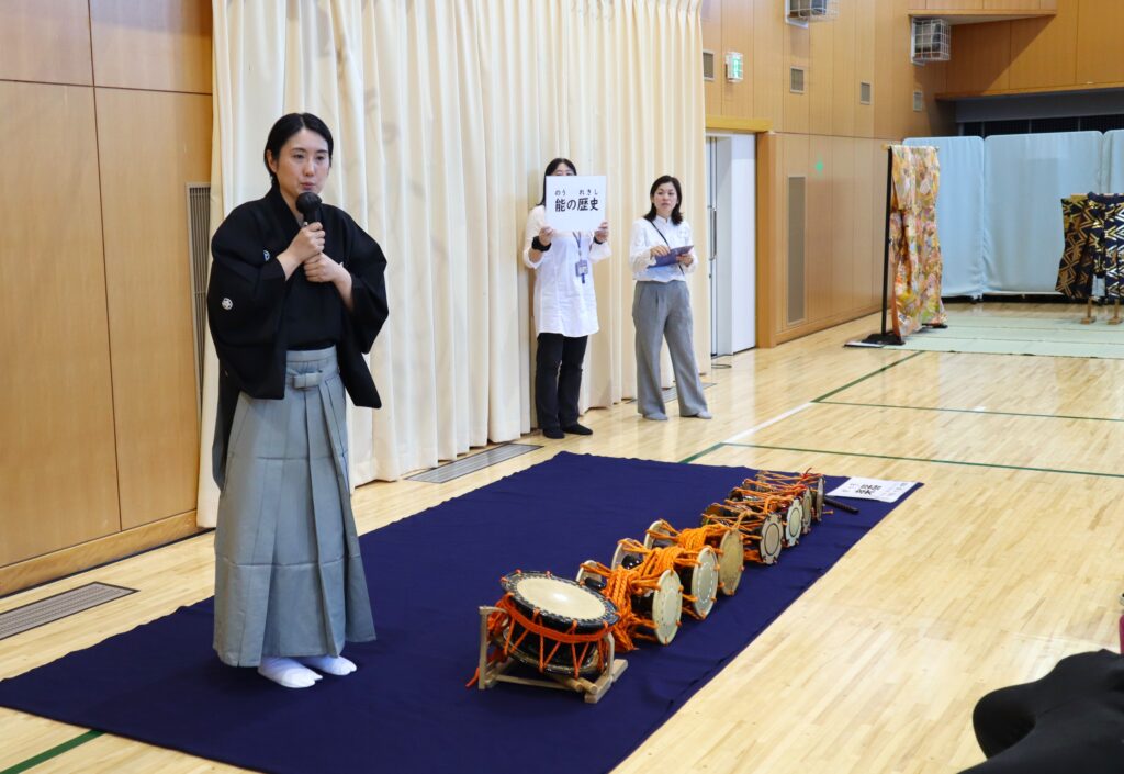 最初に能楽師の方々から能の歴史の説明がありました。歌舞伎より静かなイメージがある能ですが、元々は「猿楽(さるがく)」と呼ばれ、室町時代に観阿弥と世阿弥によって広まりました。