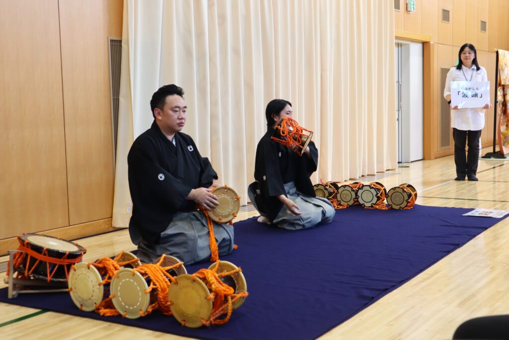 続いて、小鼓(こつづみ)と大鼓(おおつづみ)を演奏する専門職の小鼓方と大鼓方によって源平合戦の歴史を題材にした「波頭」という演目を披露してもらいました。能の演目は実に250曲あまりもあるそうです。