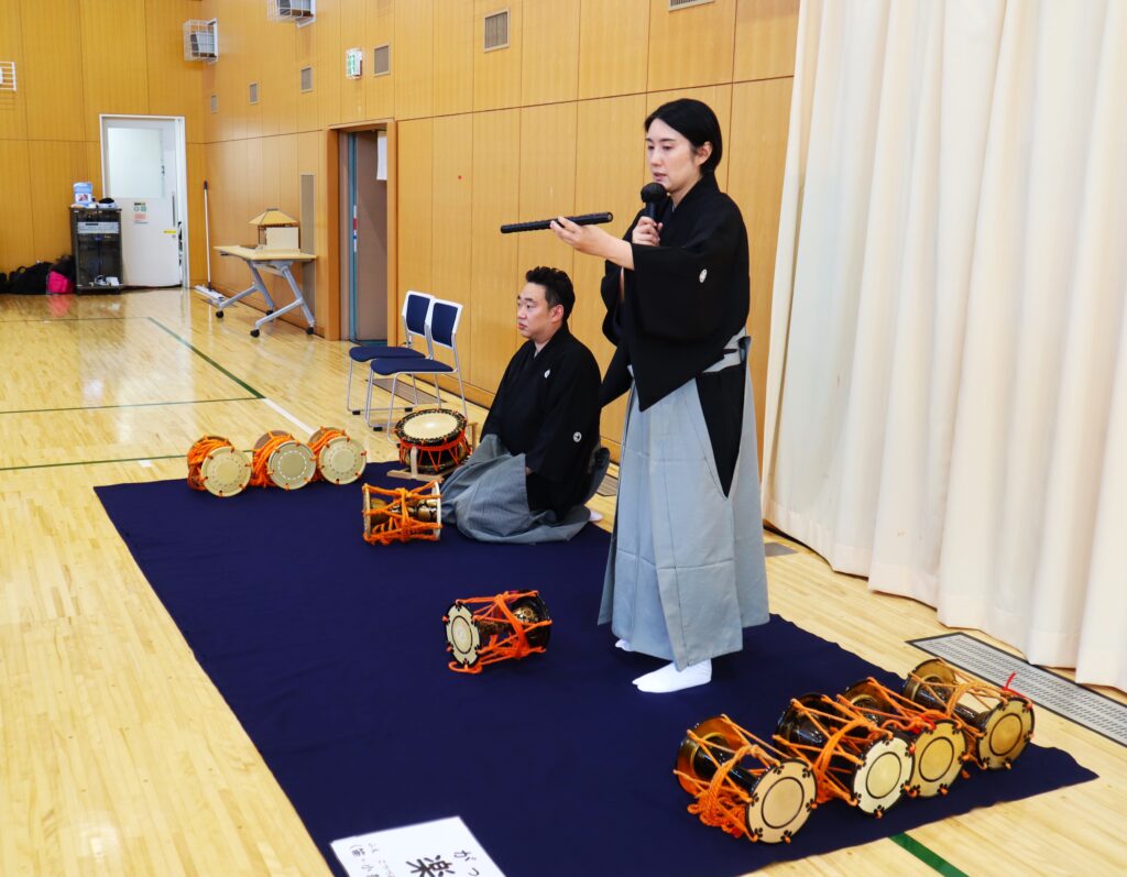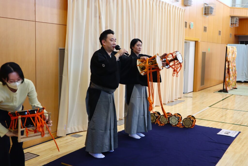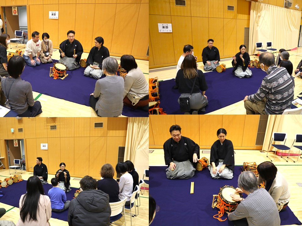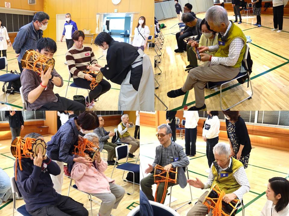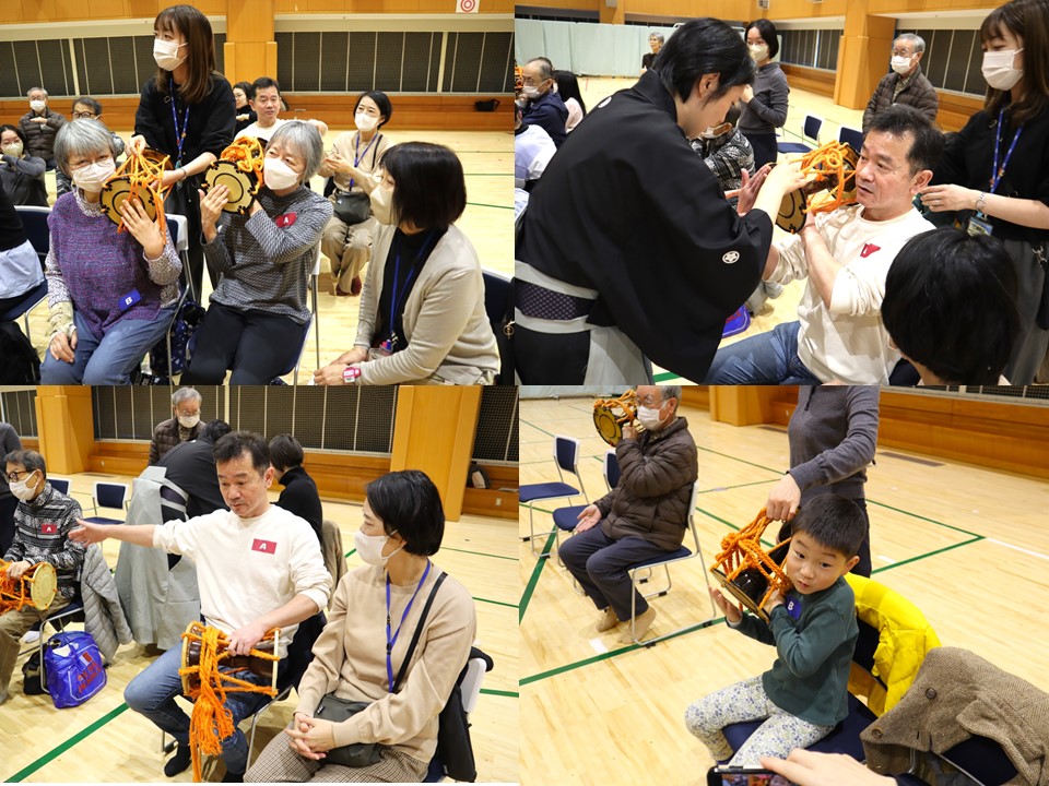 大鼓は、そのままたたくと非常に痛いので、体験した参加者の方々は驚いていました。