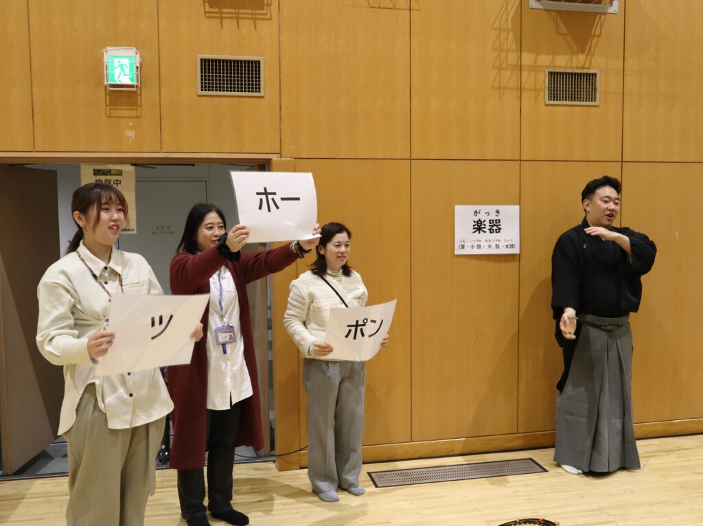 聴覚障害の方にもたたくタイミングが分かるように、掛け声を書いたプレートを示して体験してもらいました。