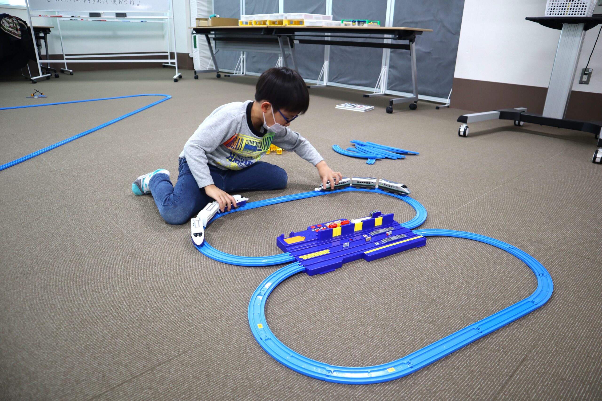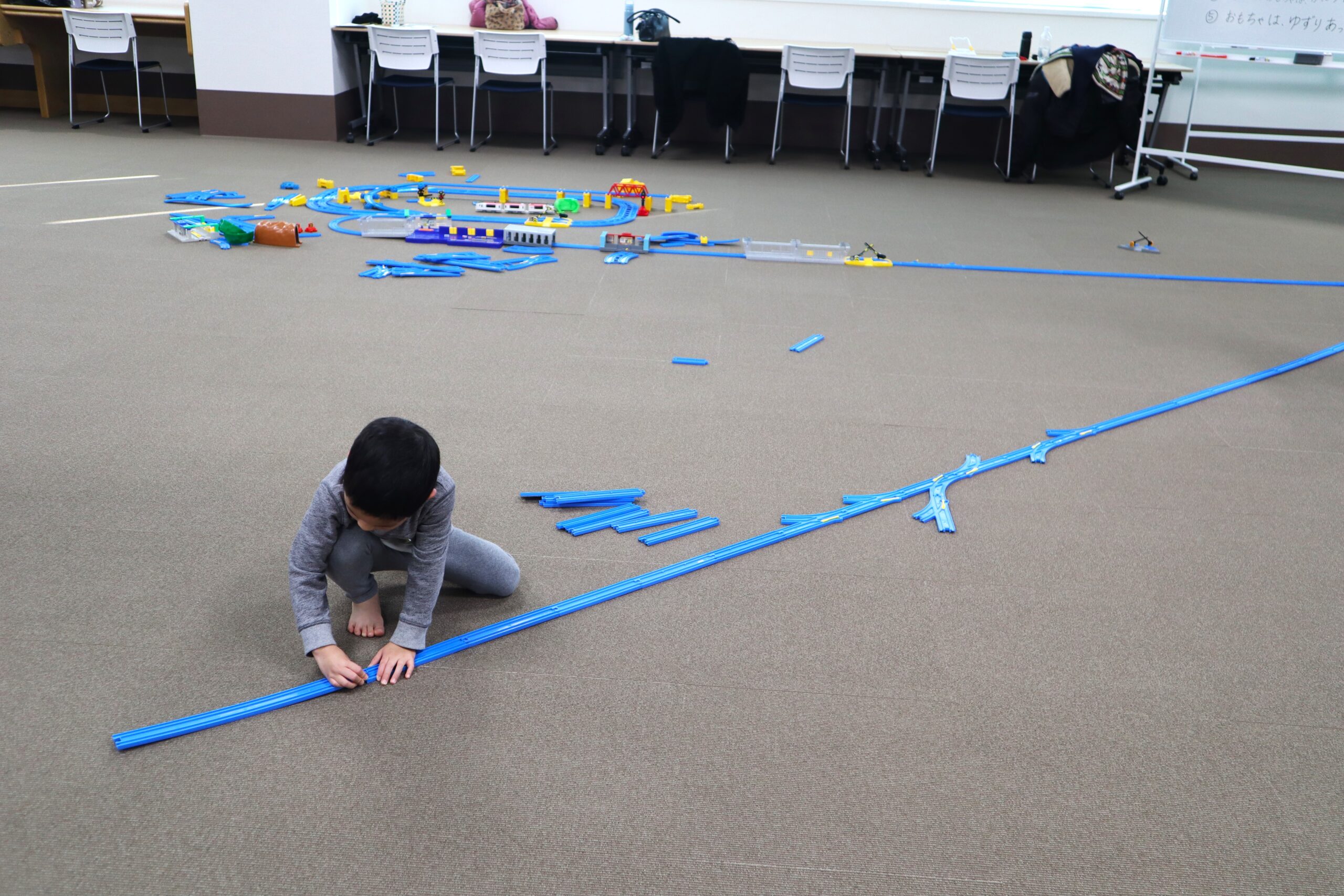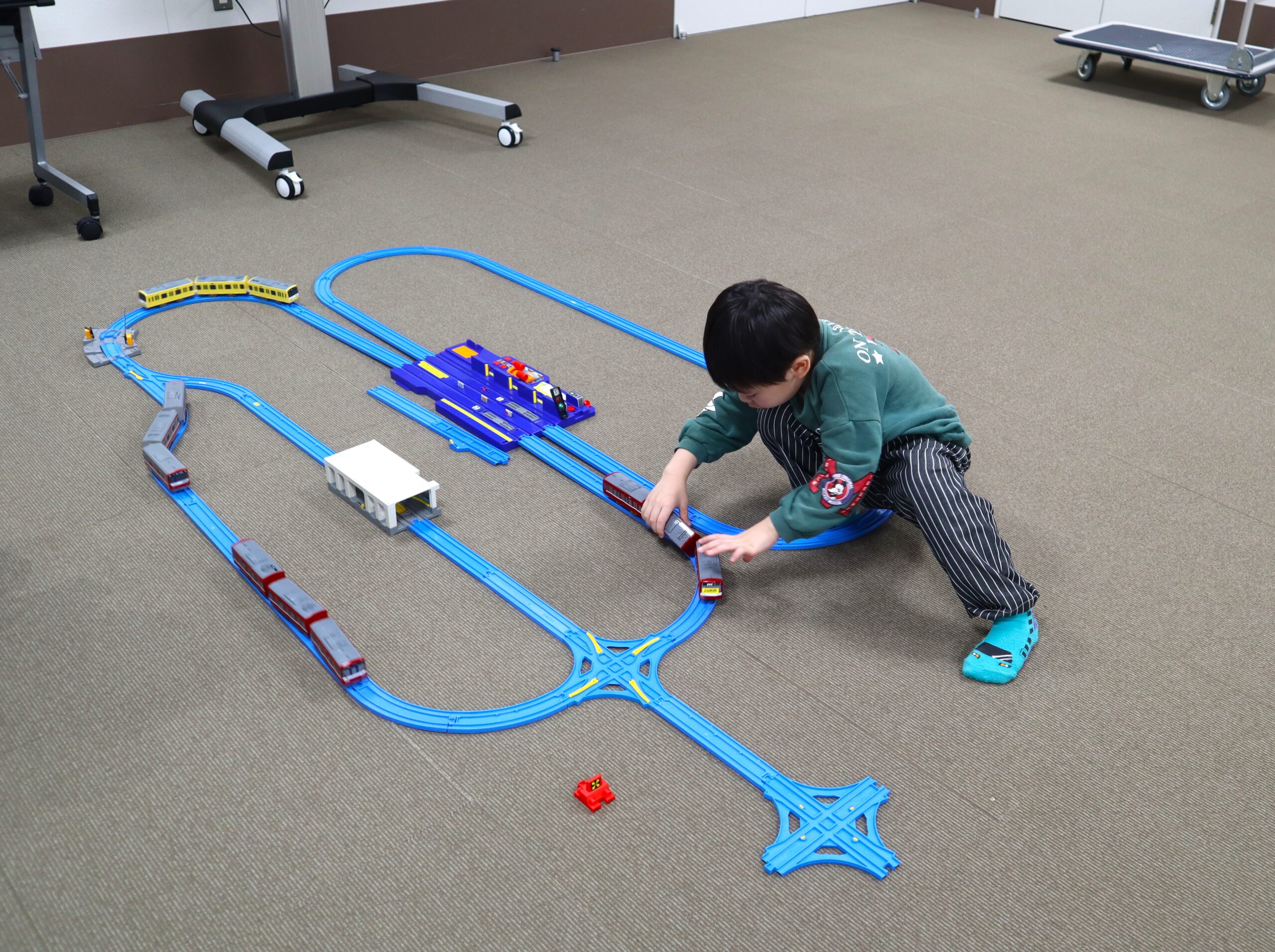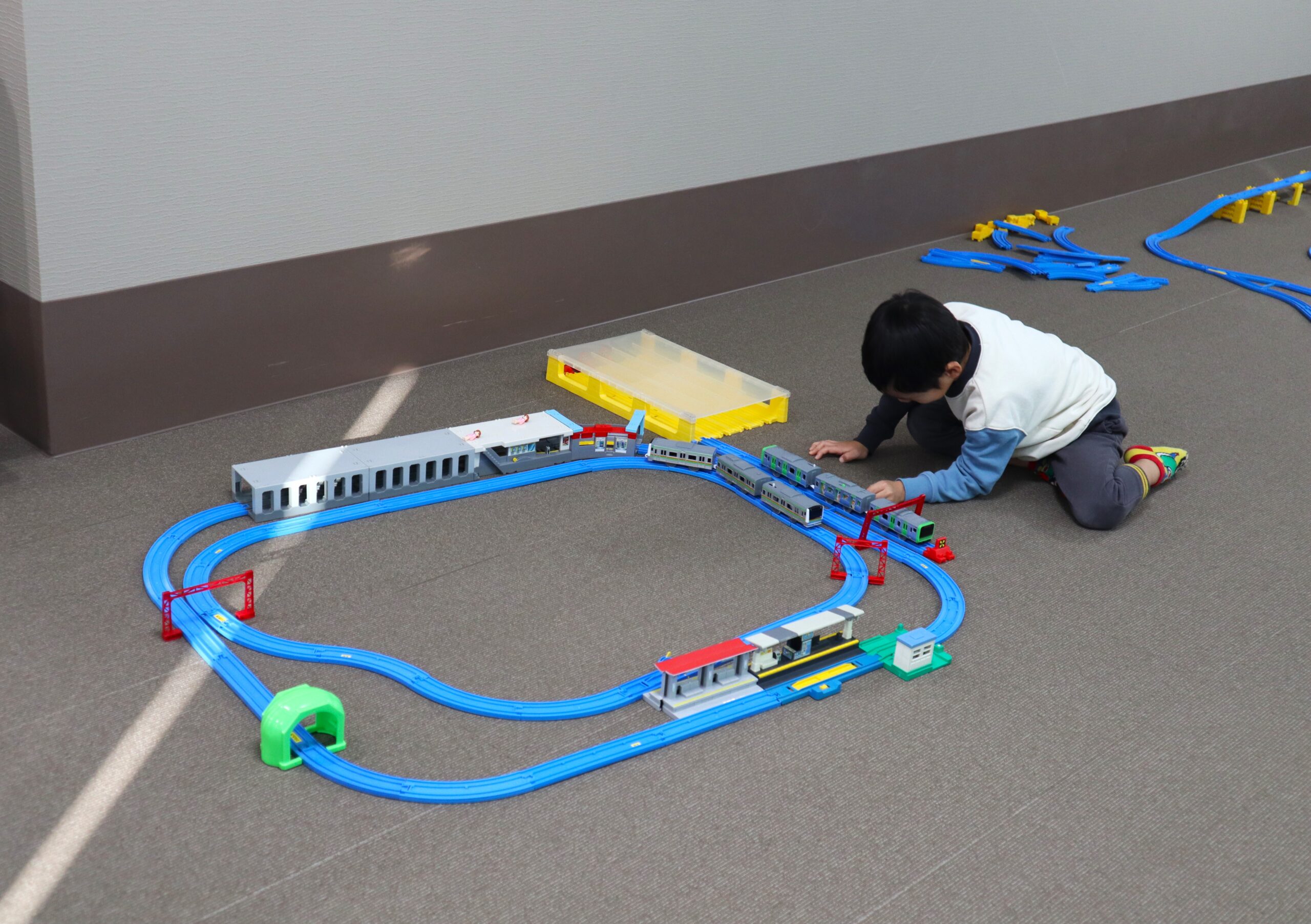 ラポール上大岡8階・多目的室の広い空間を使って、自由にプラレールを組み立てて、2時間思いっきり遊ぶことが出来る「プラレールであそぼう!」