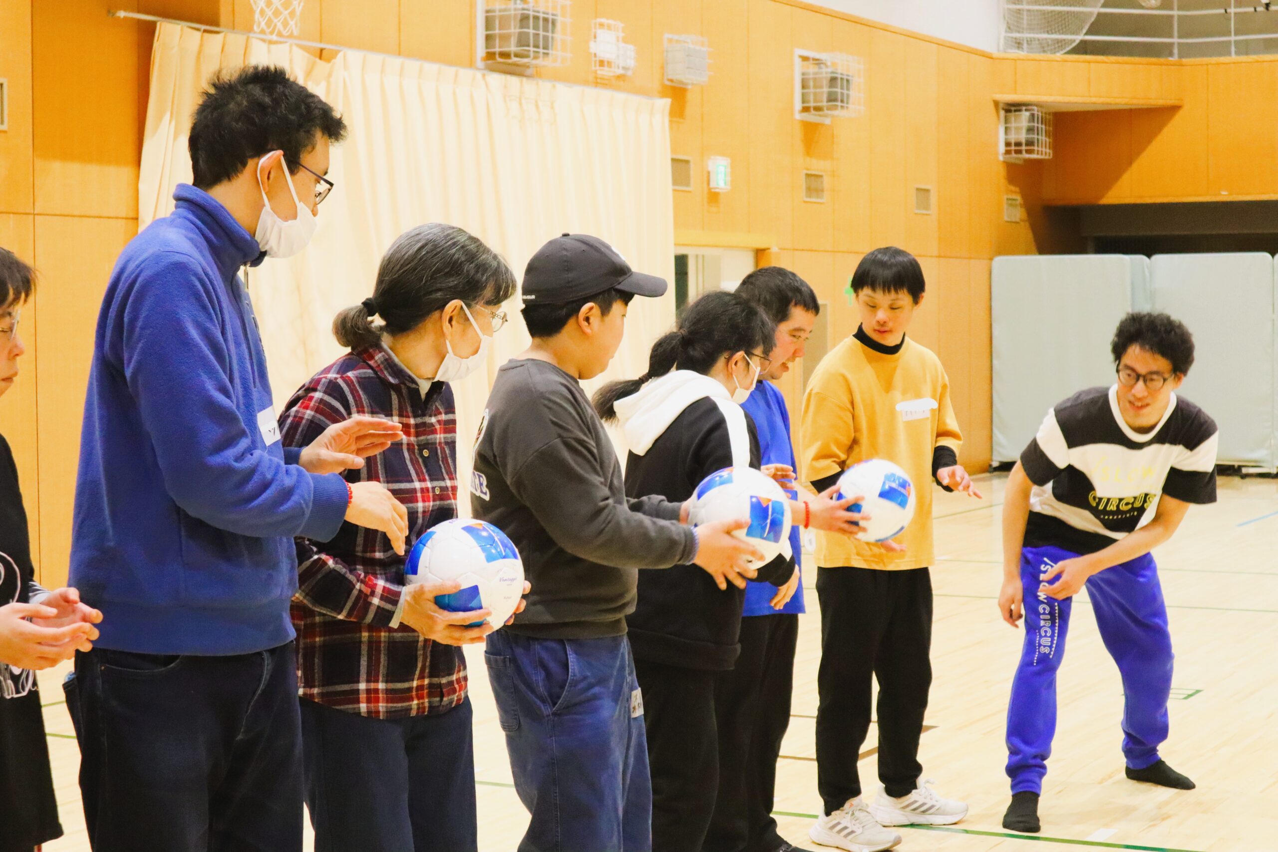 今年の記念すべき第1回は「ボールであそぼう!みんなで創作パフォーマンス」でした。大小いろんなサイズのボールを使って、ジャグリングにも応用できるパス&キャッチを練習しました。