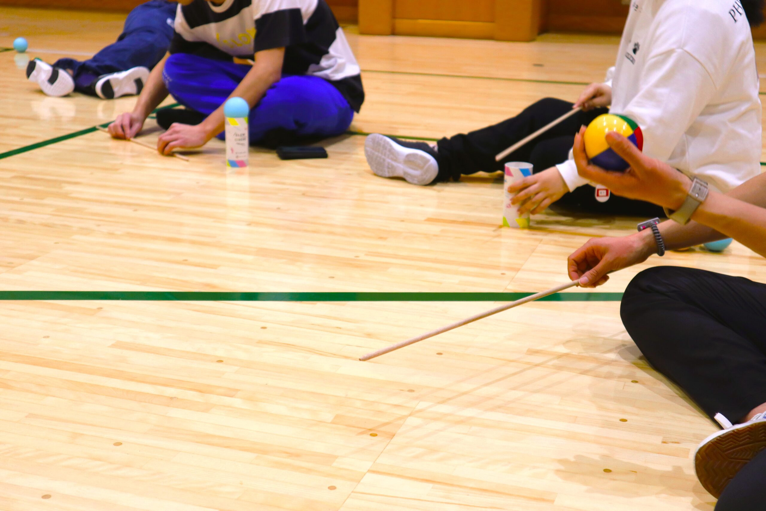 普段は投げたり回したりする道具を使って、メトロノームの拍に合わせて音を出してみます。シャカシャカ、カンカン、ポテポテ、といろんな音が重なって、立派なアンサンブルが完成しました!