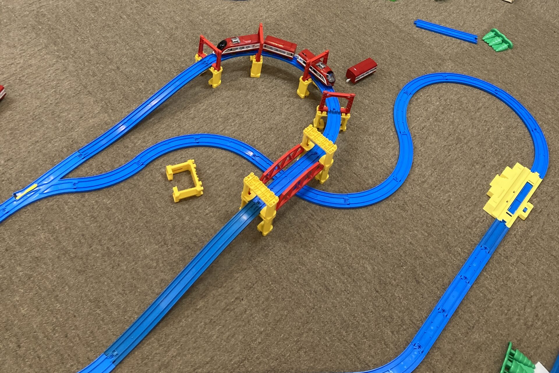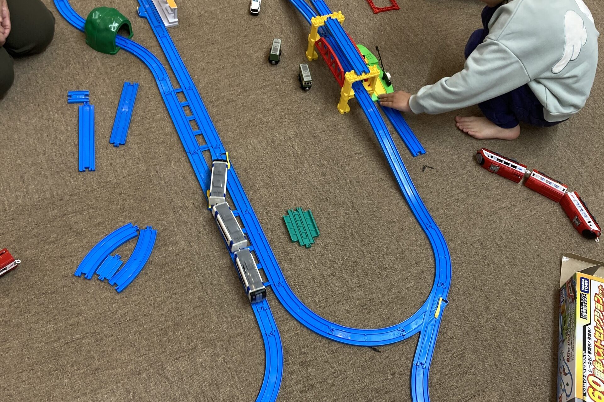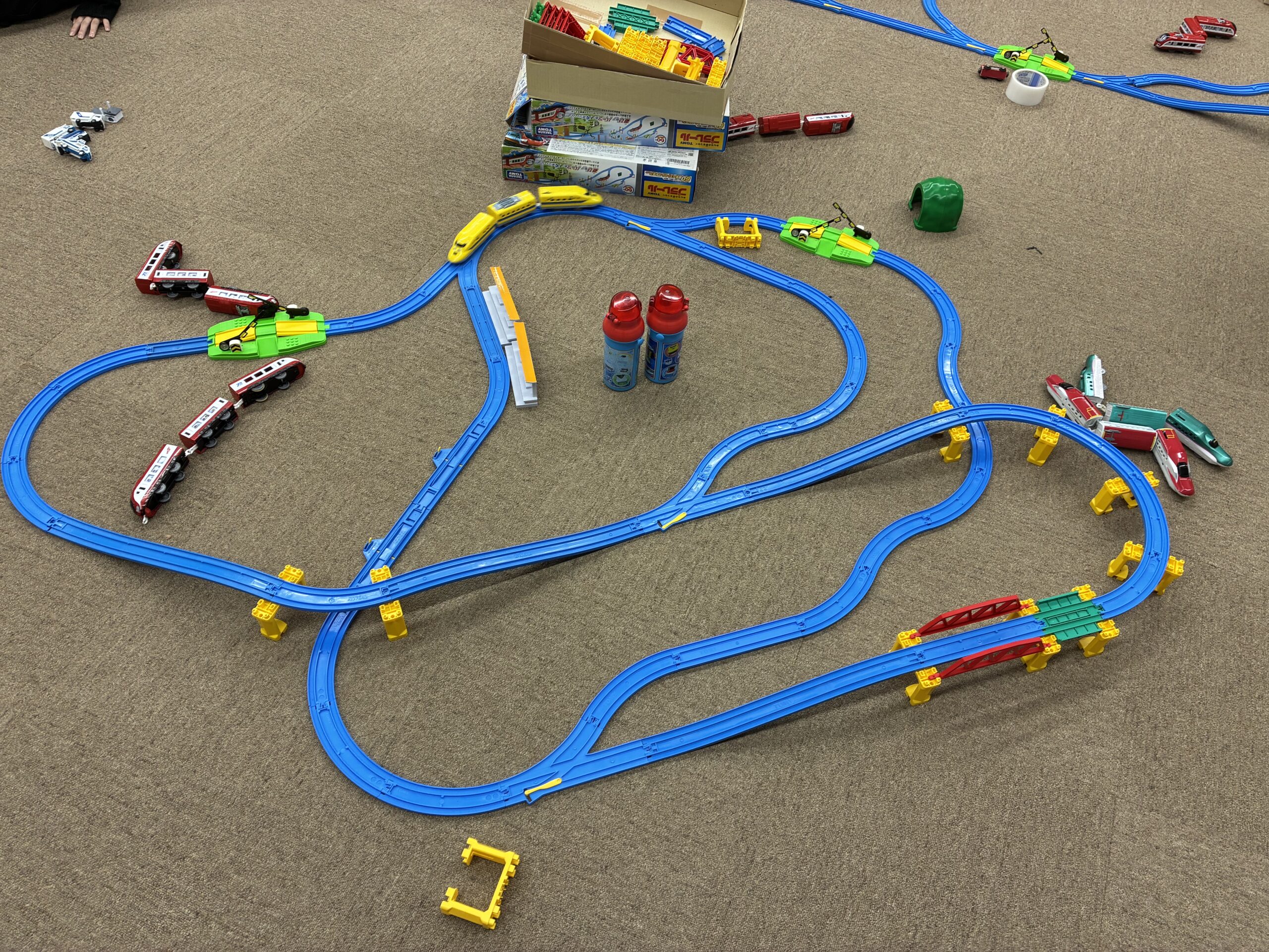まず、箱に描いてある通りに組み上げるご家族もいれば、どんどんフリーパーツも組み込んで線路を延伸していくご家族もいて、会場いっぱいにそれぞれのレールが組みあがっていきました。