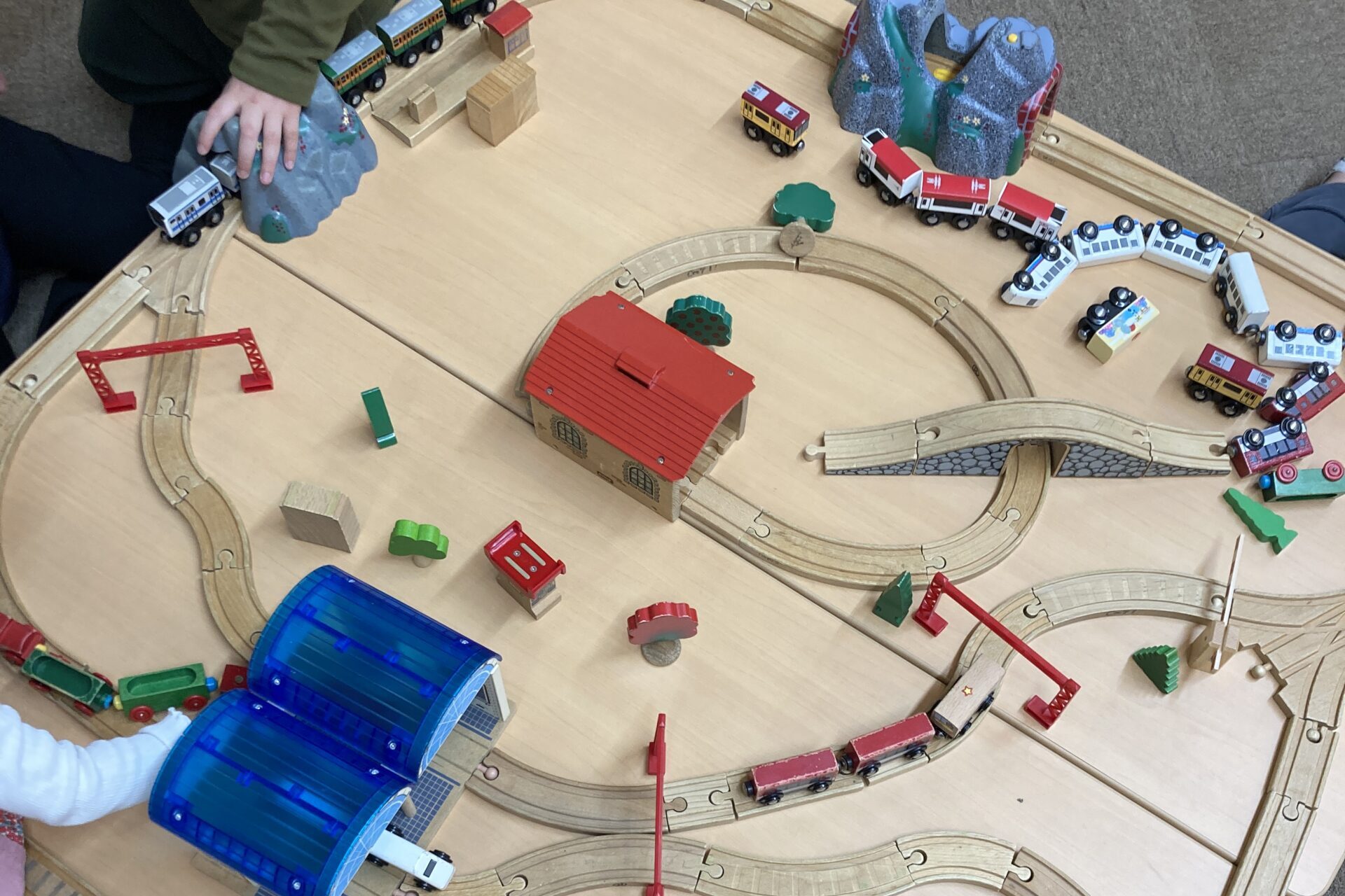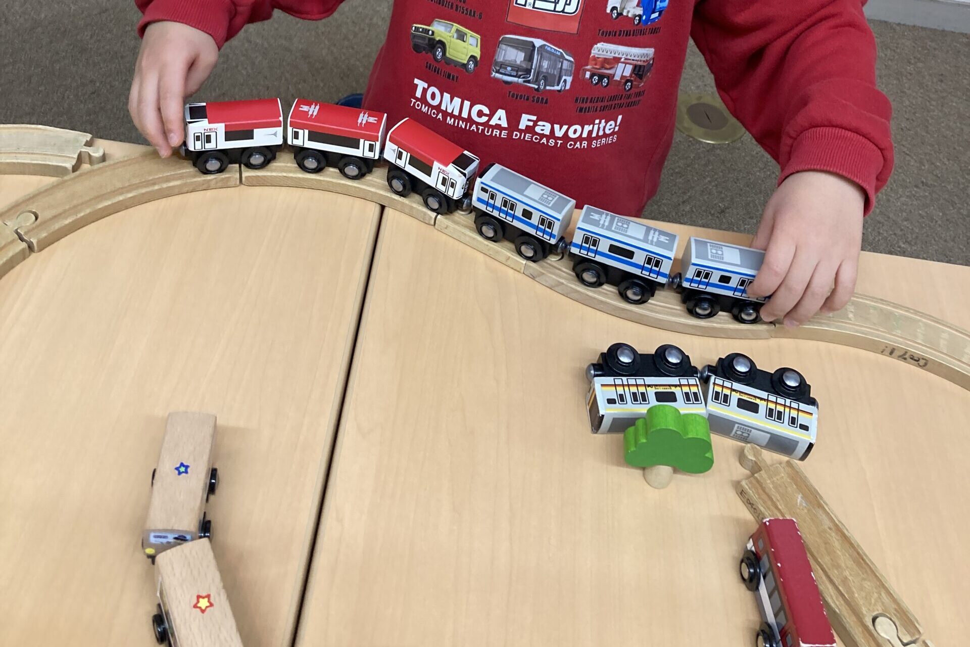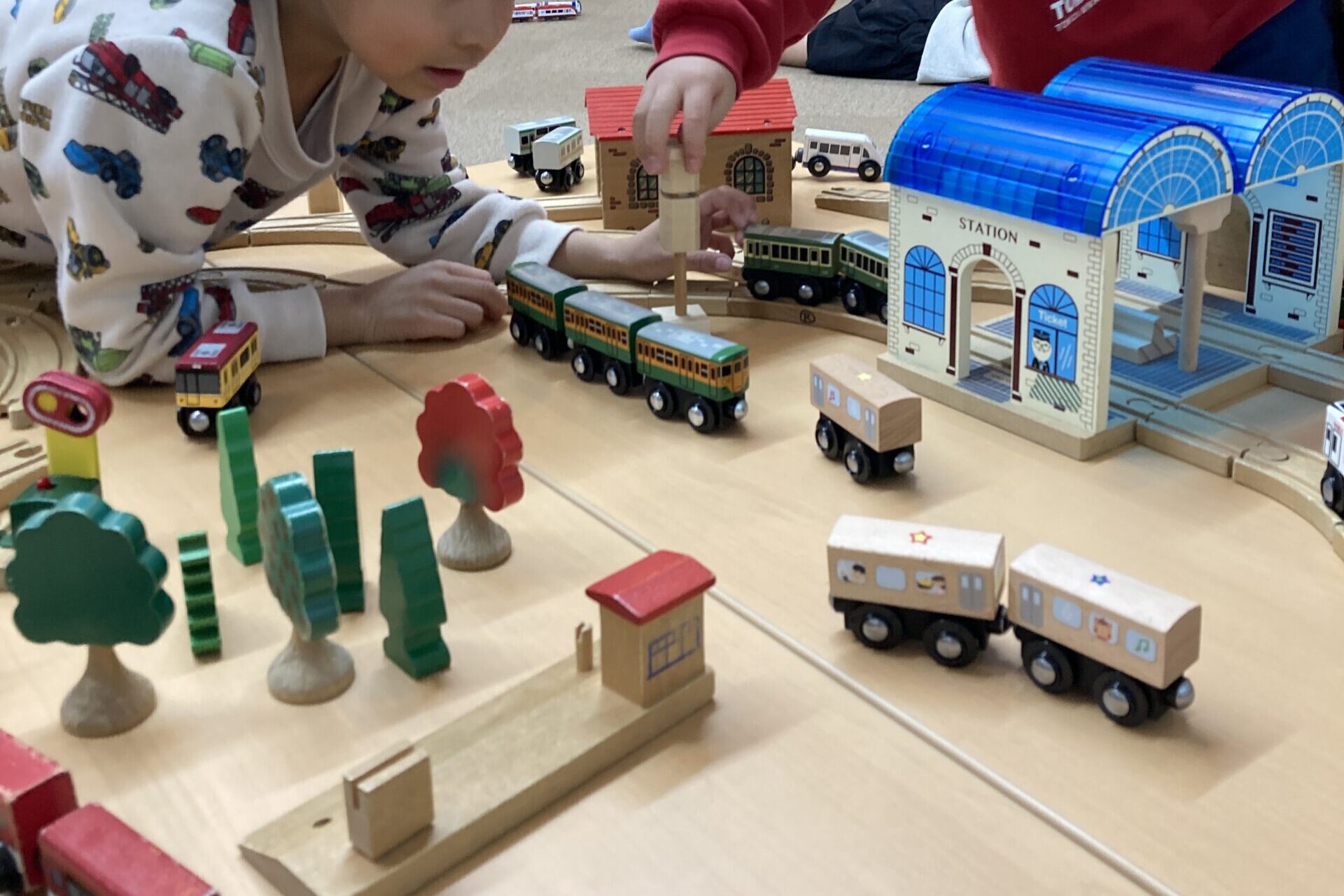 写真にあるように、木製の電車レールセットも大人気で、テーブルの上に所狭しとつないだレールの上を、何両も連結した列車を縦横無尽に走らせ楽しむお子さん達。時にはお友だちとぶつかることもあるけれど、とにかくレールも列車もたくさんあるので、みんなで一緒に場所を使うことができていました。