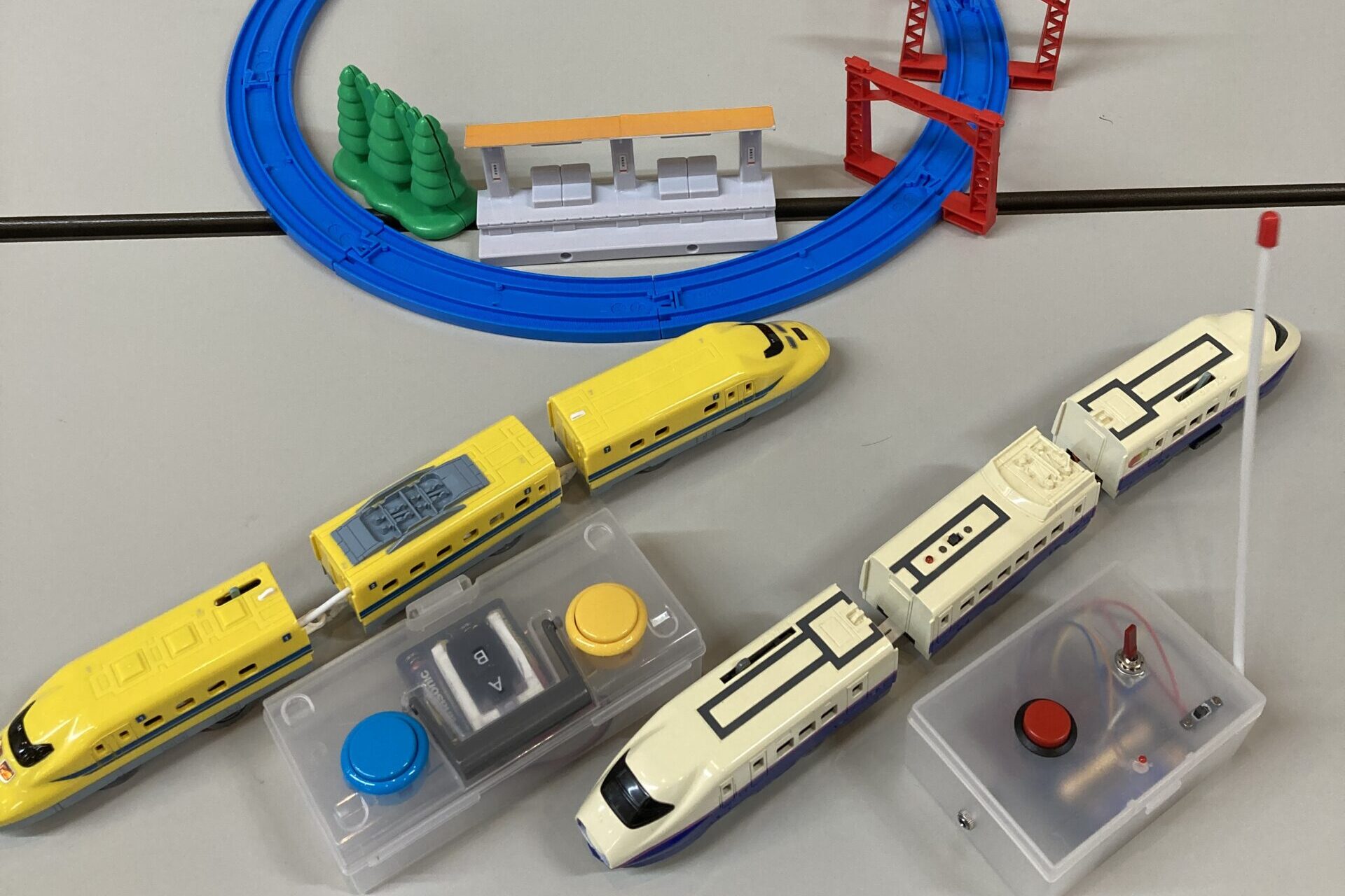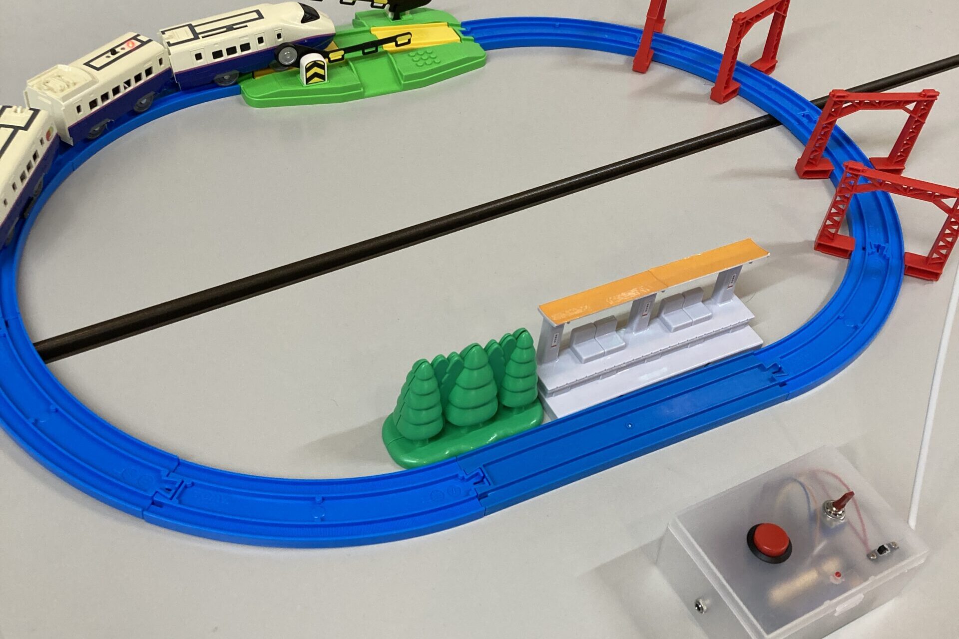 今回は、ラポールおもちゃ病院のおもちゃドクターが改修してくださった「リモコンプラレール」の体験ができるコーナーも設け、手作りスイッチで、遠隔でプラレールを動かして遊ぶ体験もしていただきました。