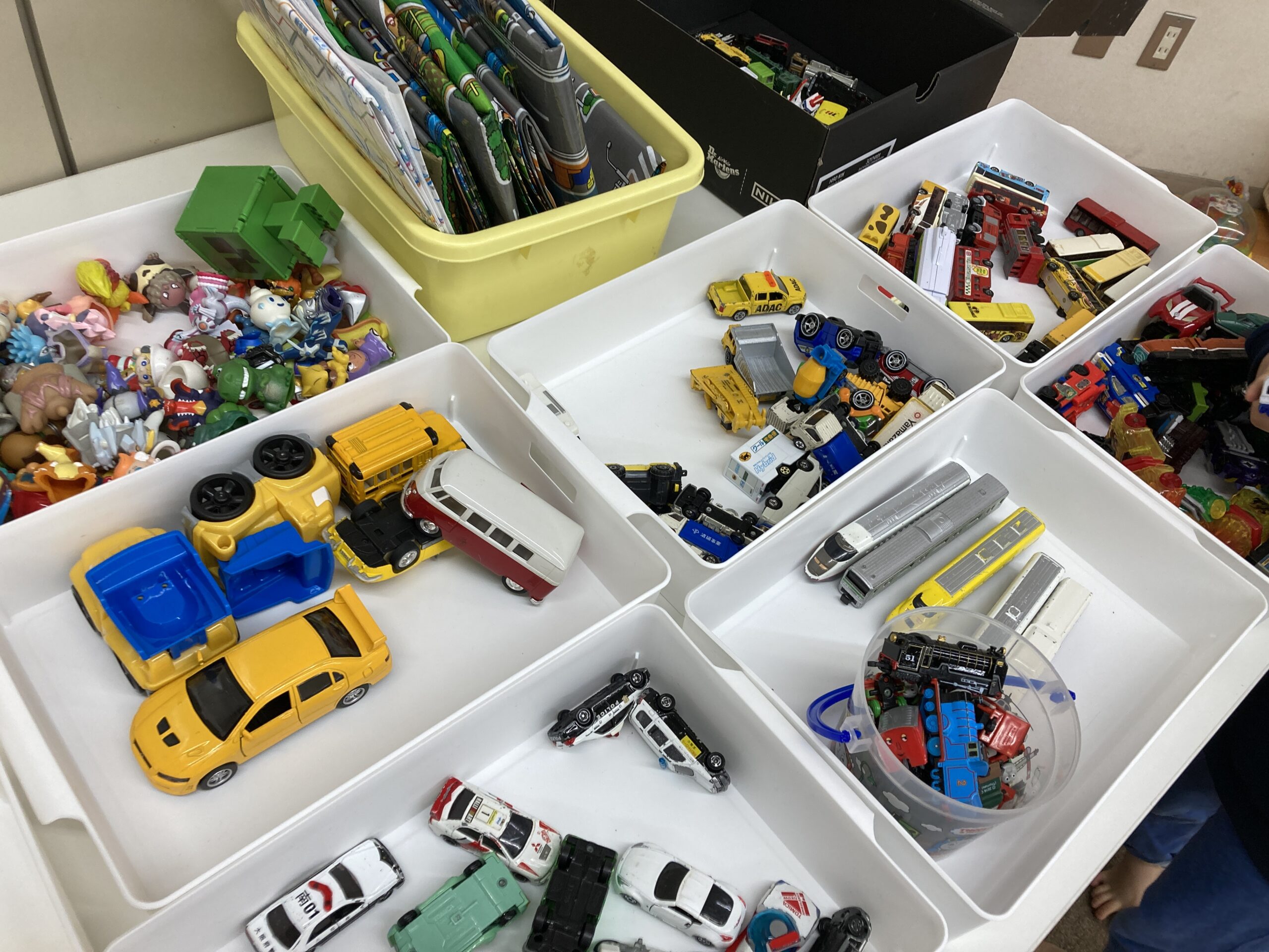 このイベントでは、お子さん(ごきょうだい含む)一人に1セットのプラレールセットをお配りしています。会場にはフリーのレールパーツや列車も用意し、たくさんのミニカーやミニフィギュア、おもちゃもあり、お子さんが時間いっぱい自由に遊ぶことができます。