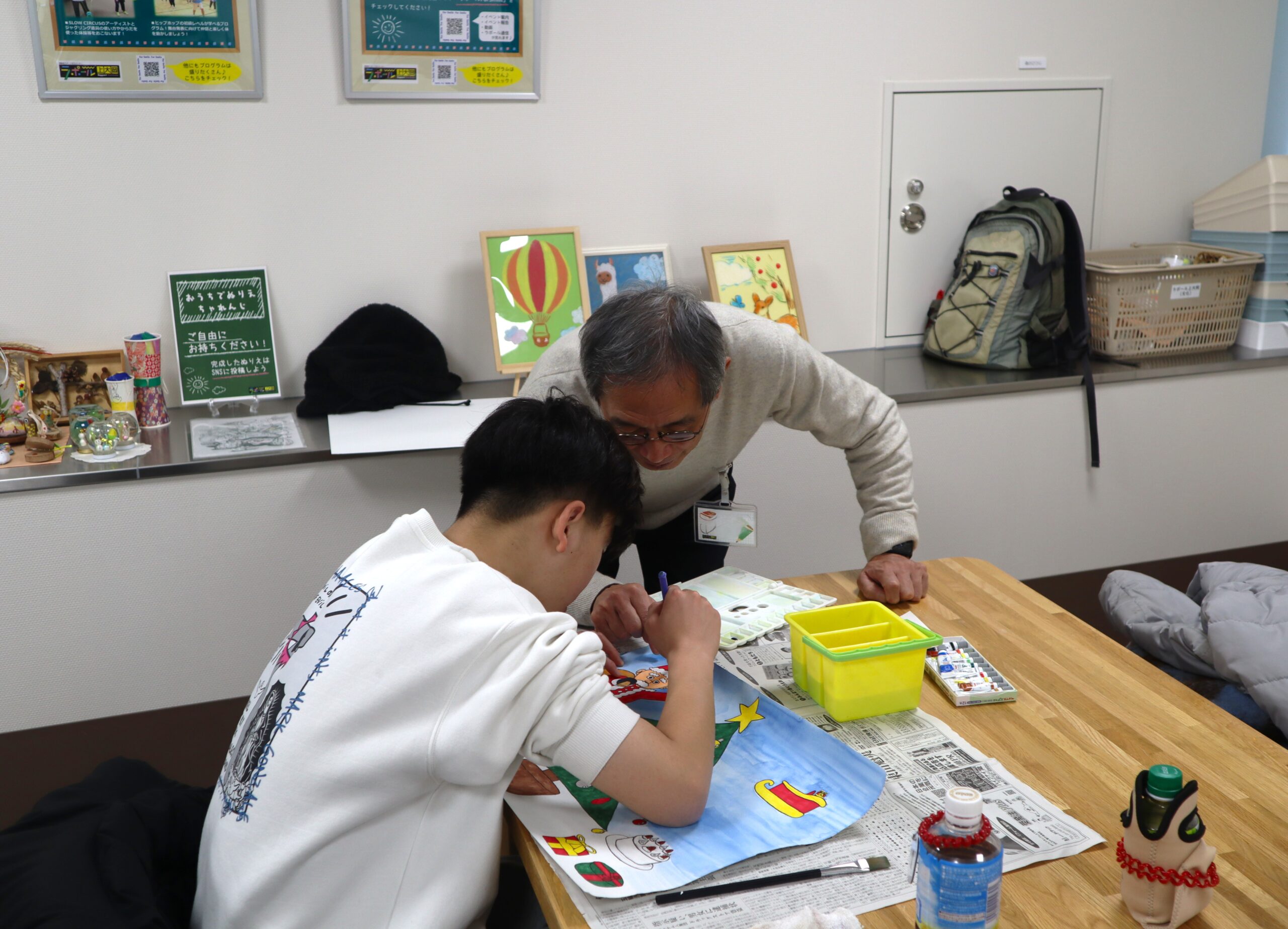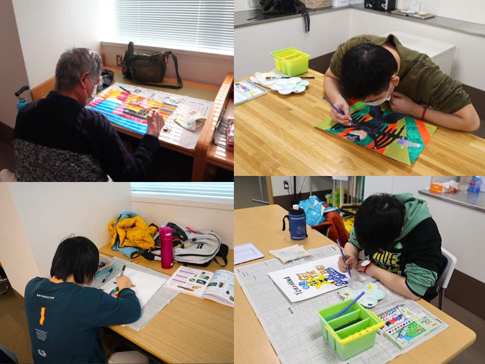 『絵画の広場』では、画材道具(画用紙、水彩絵の具、筆、パレット、筆洗器、色鉛筆、クレヨン、油性ペンなど)はレンタル出来るので、手ぶらでの参加も可能です。