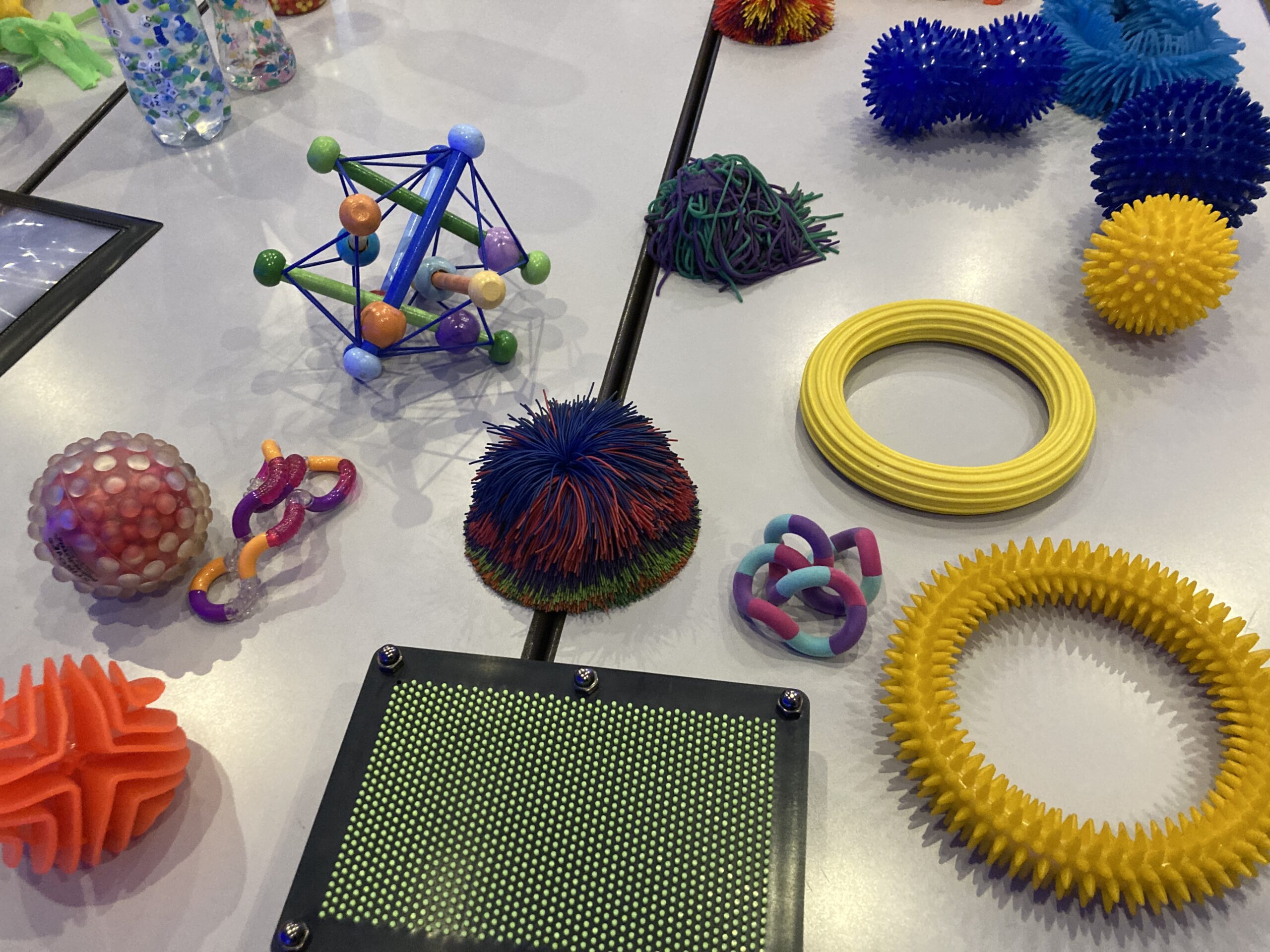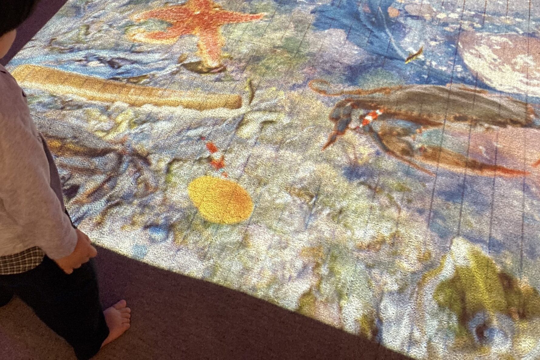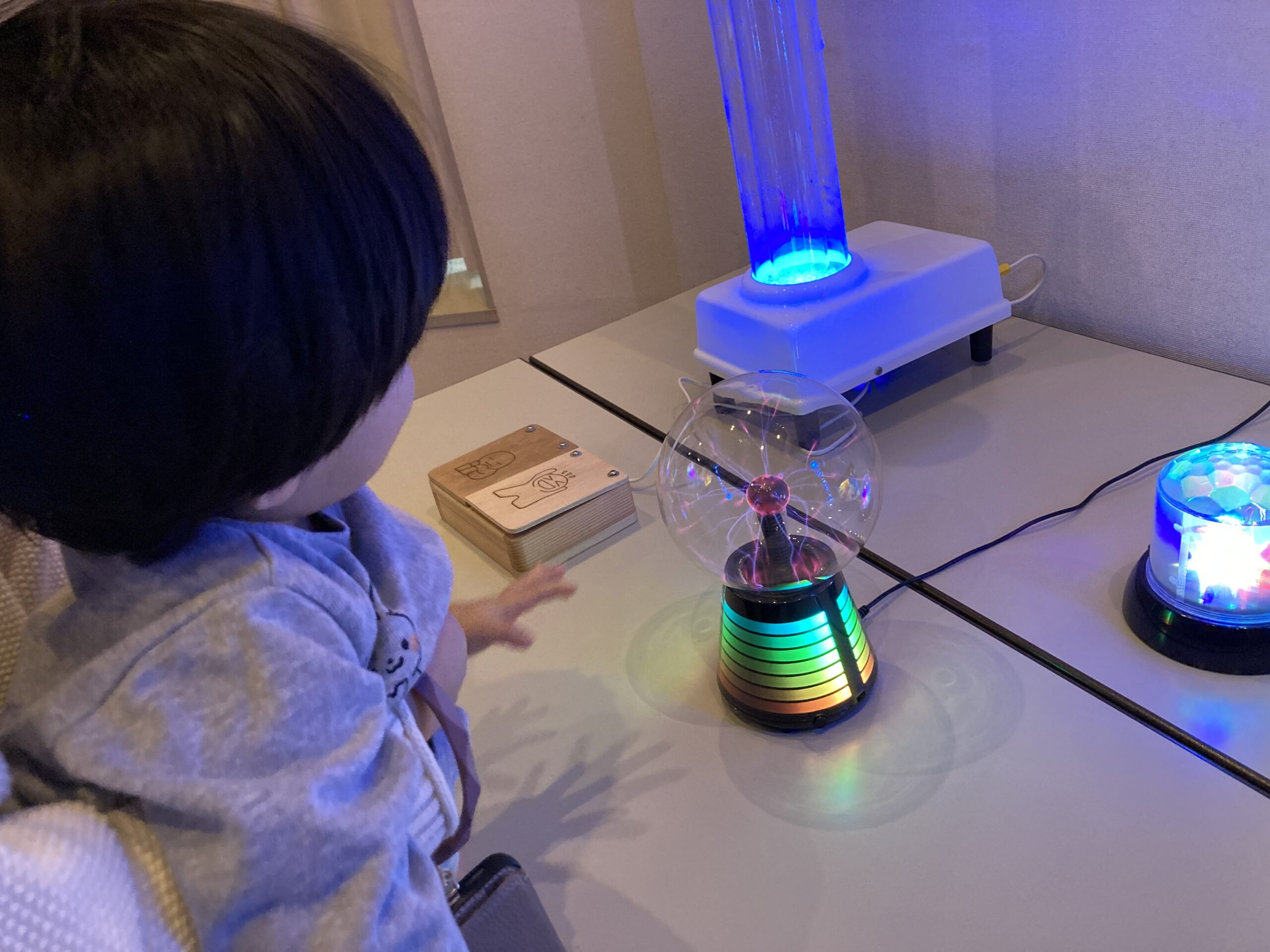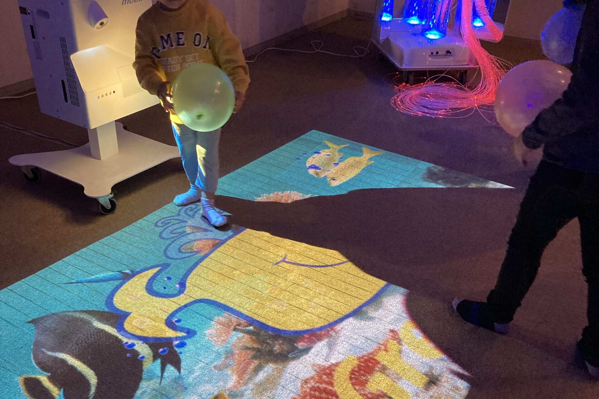 普段おもちゃ図書館にはないイベント用の光あそびグッズ、感触や音が楽しめるおもちゃ、風船入りボールプール、バブルチューブなど、また、今年度は有限会社コス・インターナショナルさんにご協力いただいて、さまざまな手触りや感触を楽しめるスヌーズレングッズ(感覚あそびグッズ)も一緒に所狭しと展示しました。さらに、床に投影した映像を触って遊べるプロジェクションマッピングのゲーム機器体験などもセッティングし、2日間で76組201人の方にお楽しみいただきました。