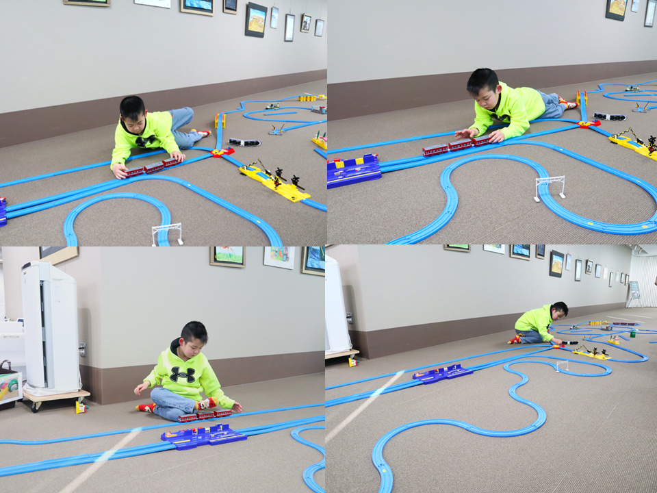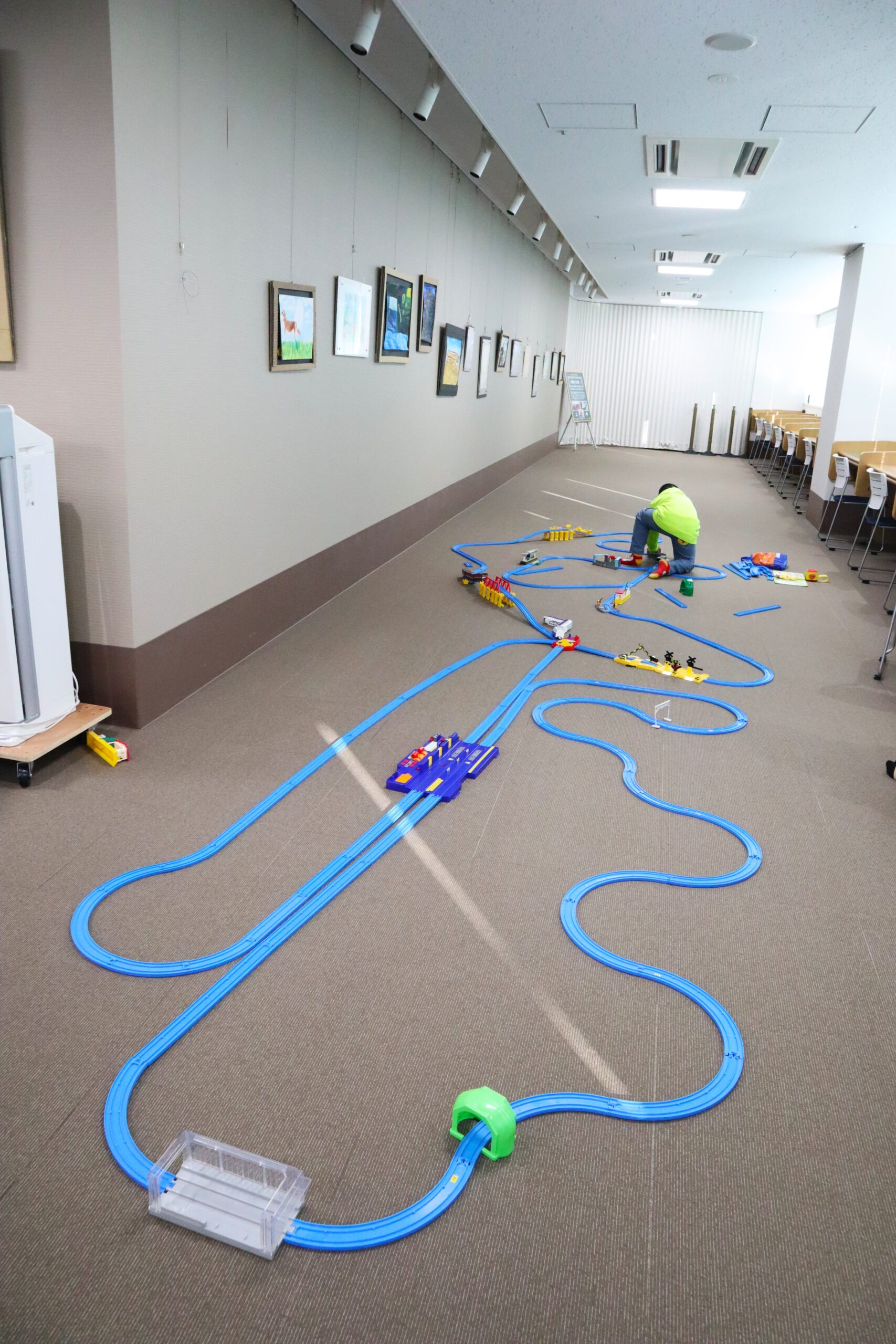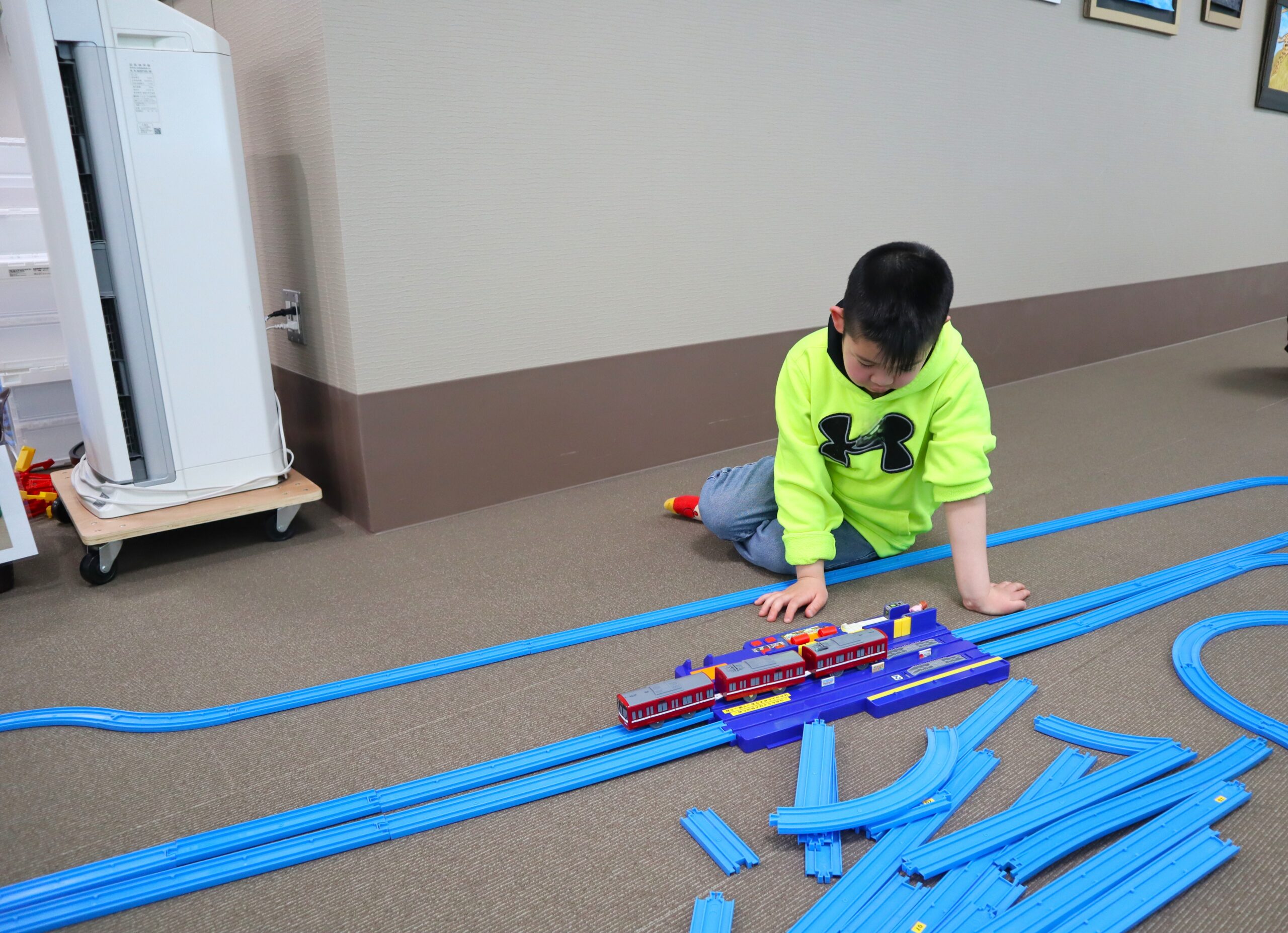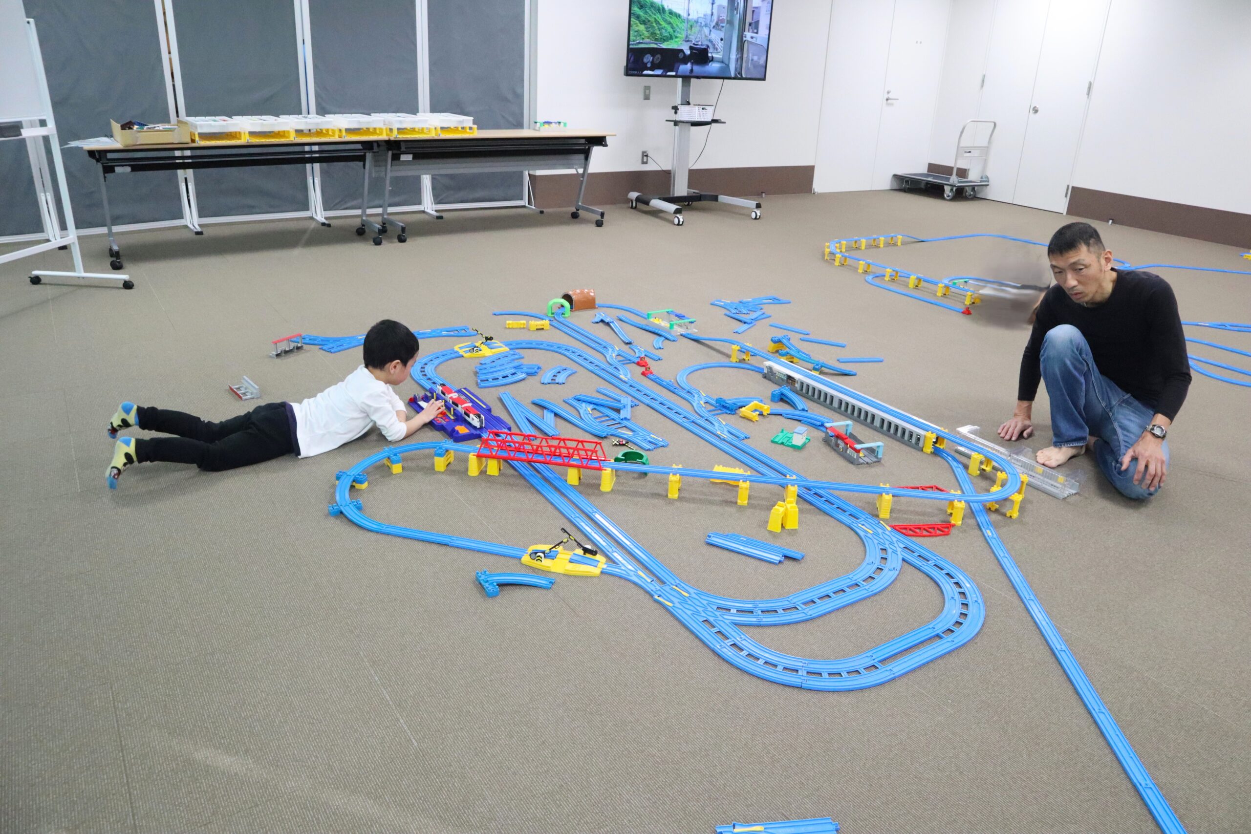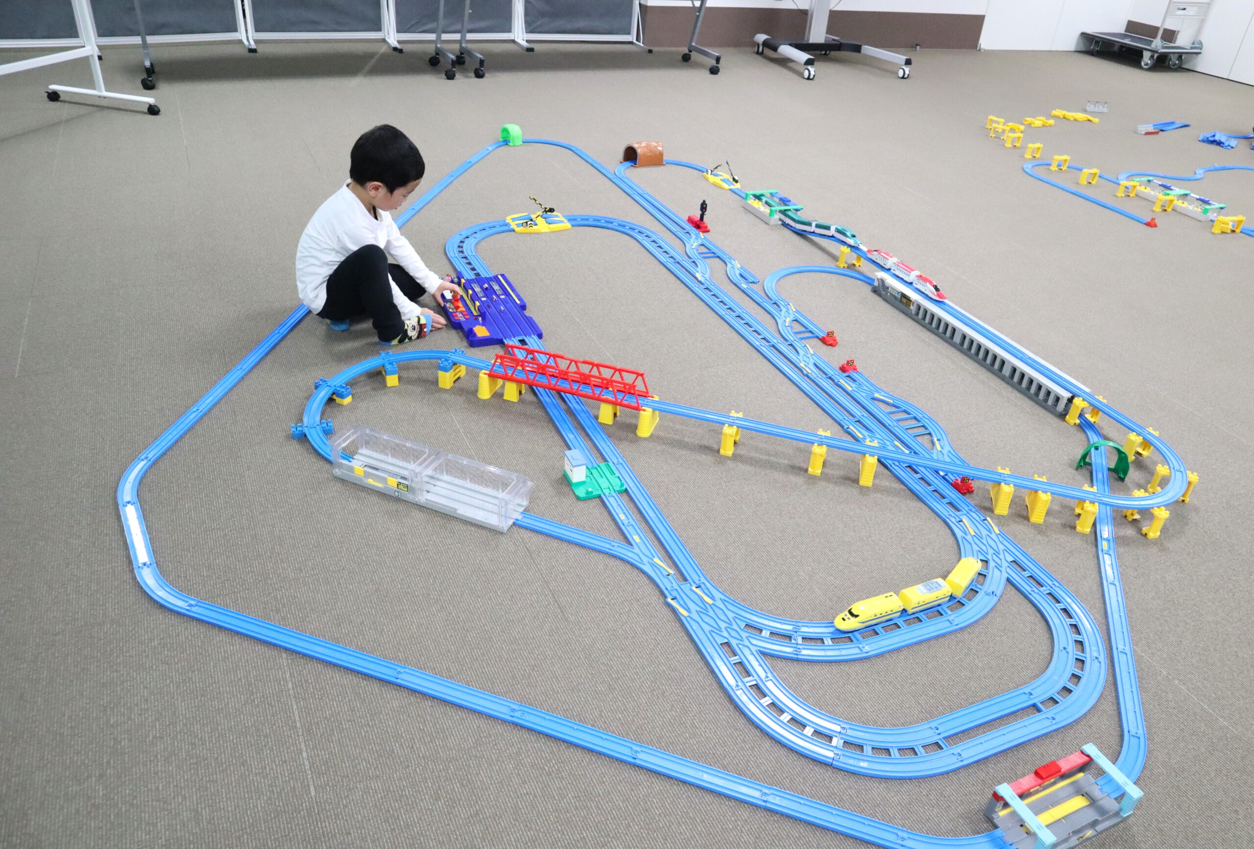 ラポール上大岡8階・多目的室の広い空間を使って、自由にプラレールを組み立てて2時間思いっきり遊ぶことが出来る「プラレールであそぼう!」