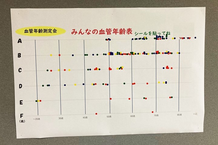 測定後は各自が表にシールを貼ることで同年代の方と比較することができ、さらに健康に対する意識向上に向けての発言が多く聞かれていました。