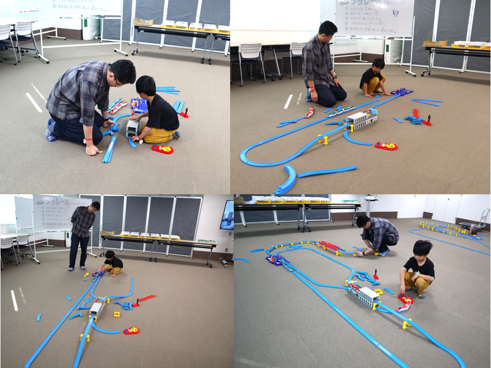 初参加の親子は、一緒にレイアウトをあれこれ考えていきます。