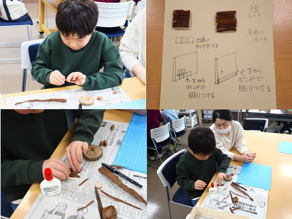 屋根になる部分には、講師の屋根の作り方を参考に木片を貼り付けていきます。
