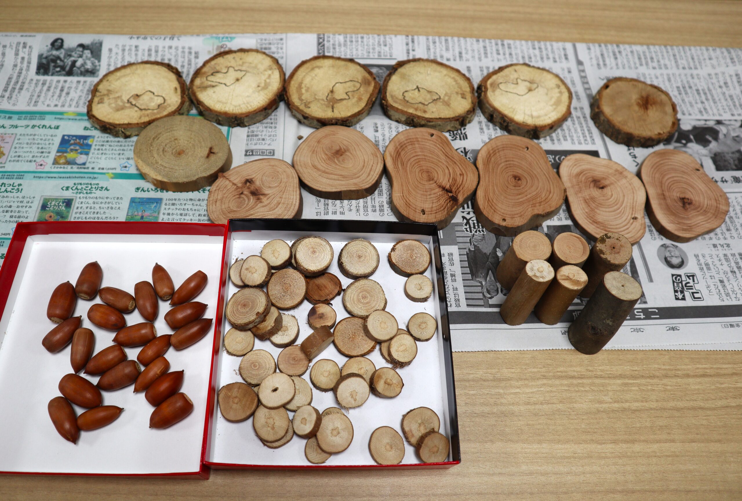 講師がどんぐりや様々な種類の種や木材などを用意してくれました。