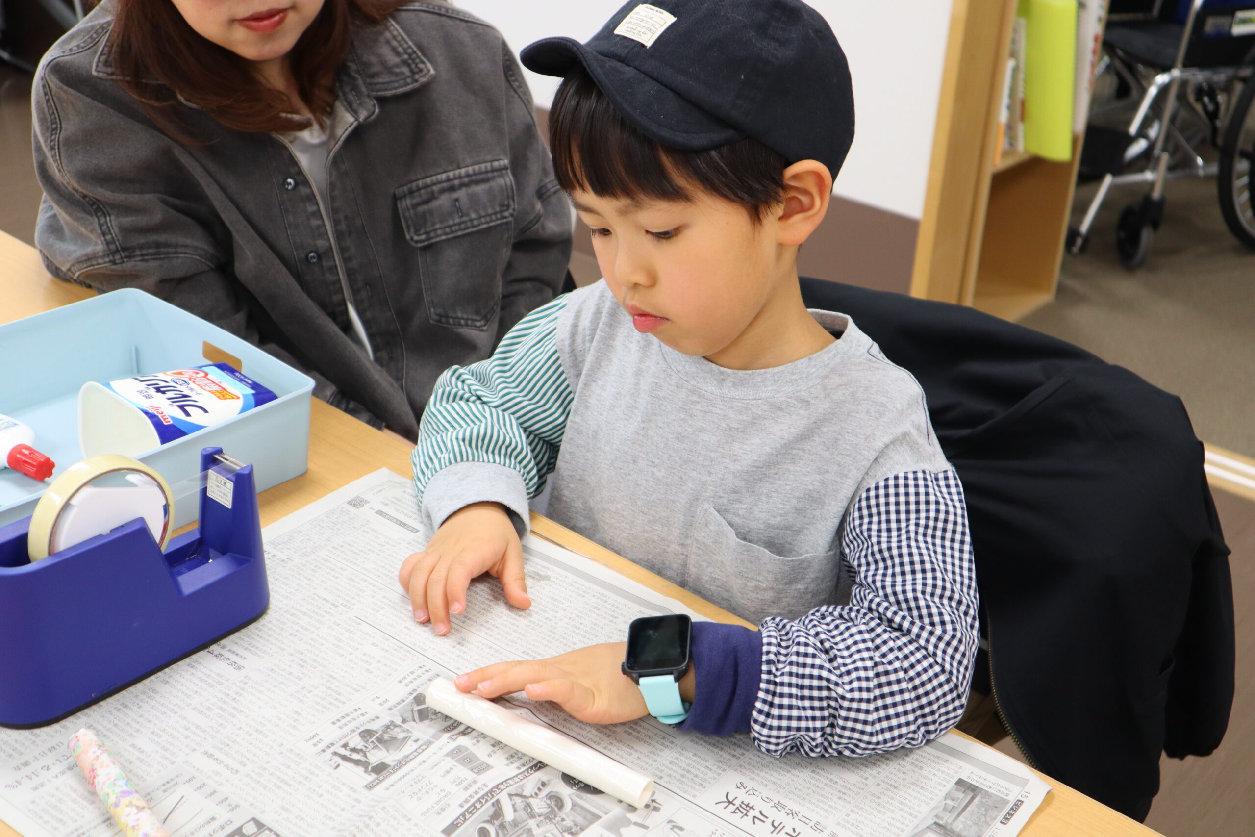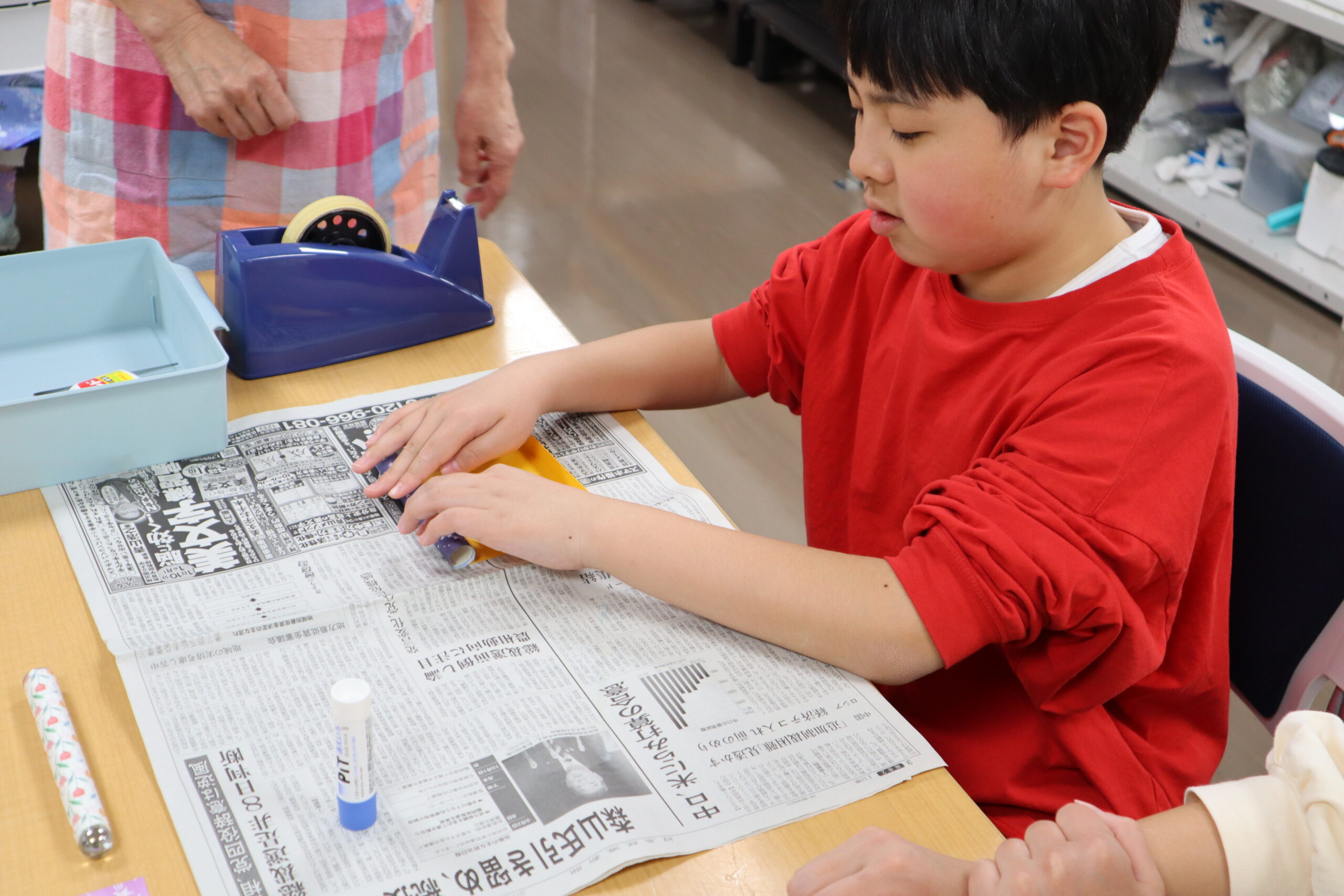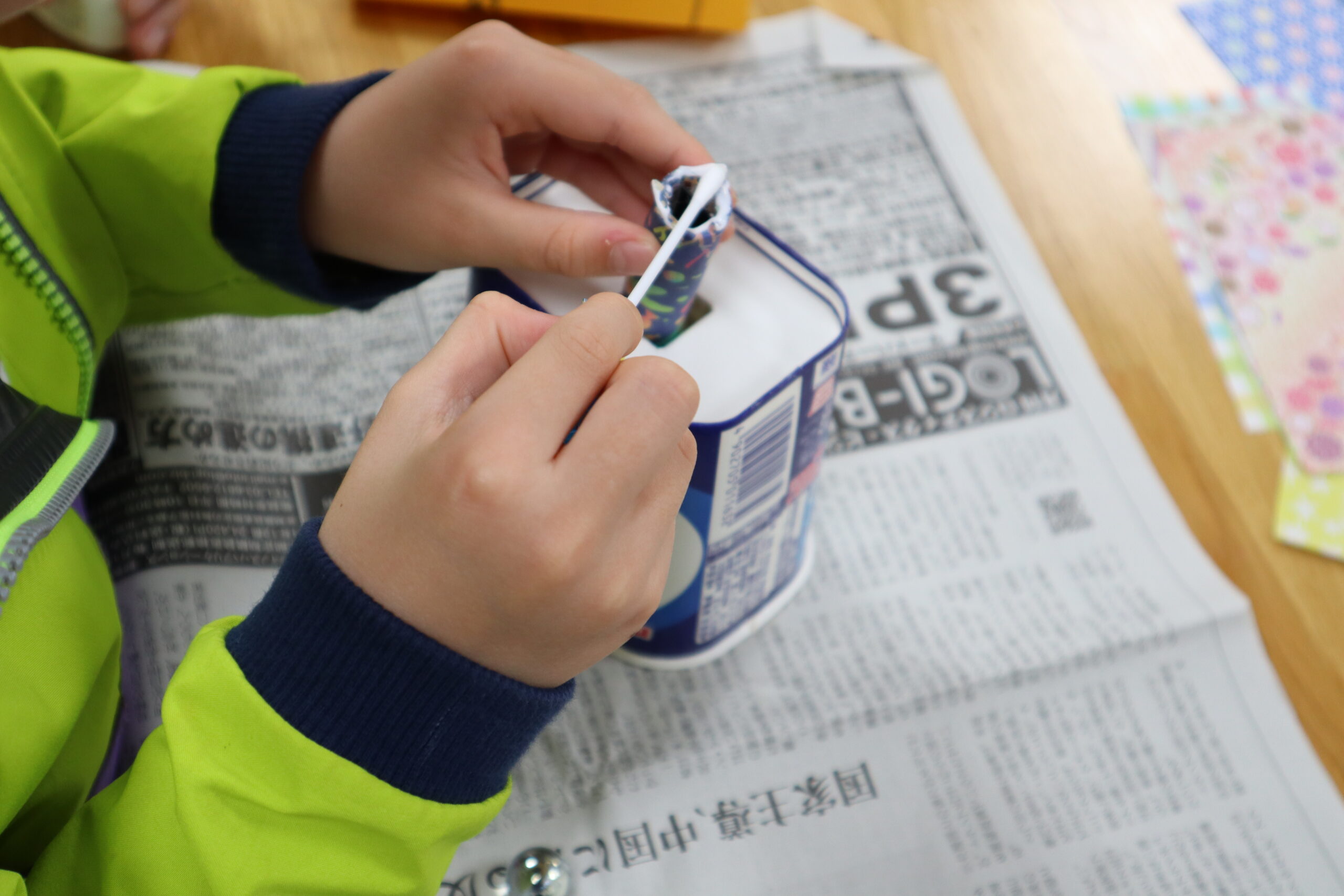 万華鏡の筒は何十種類もある折り紙の中から好きなものを選び、筒になる厚紙に張り付けていきます。