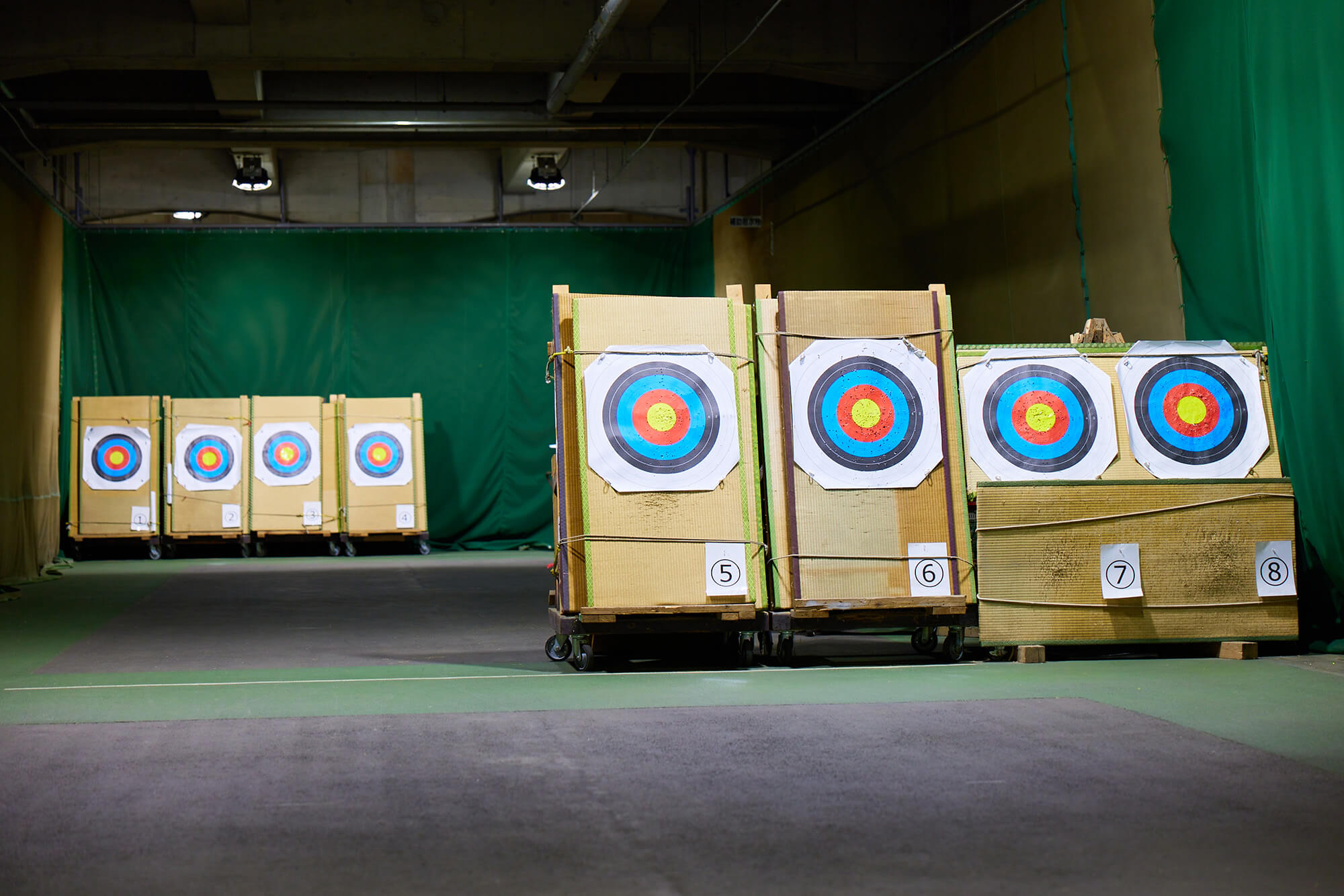 50mまでの距離に対応した屋内アーチェリー場。雨や風を心配することなくプレーできます。