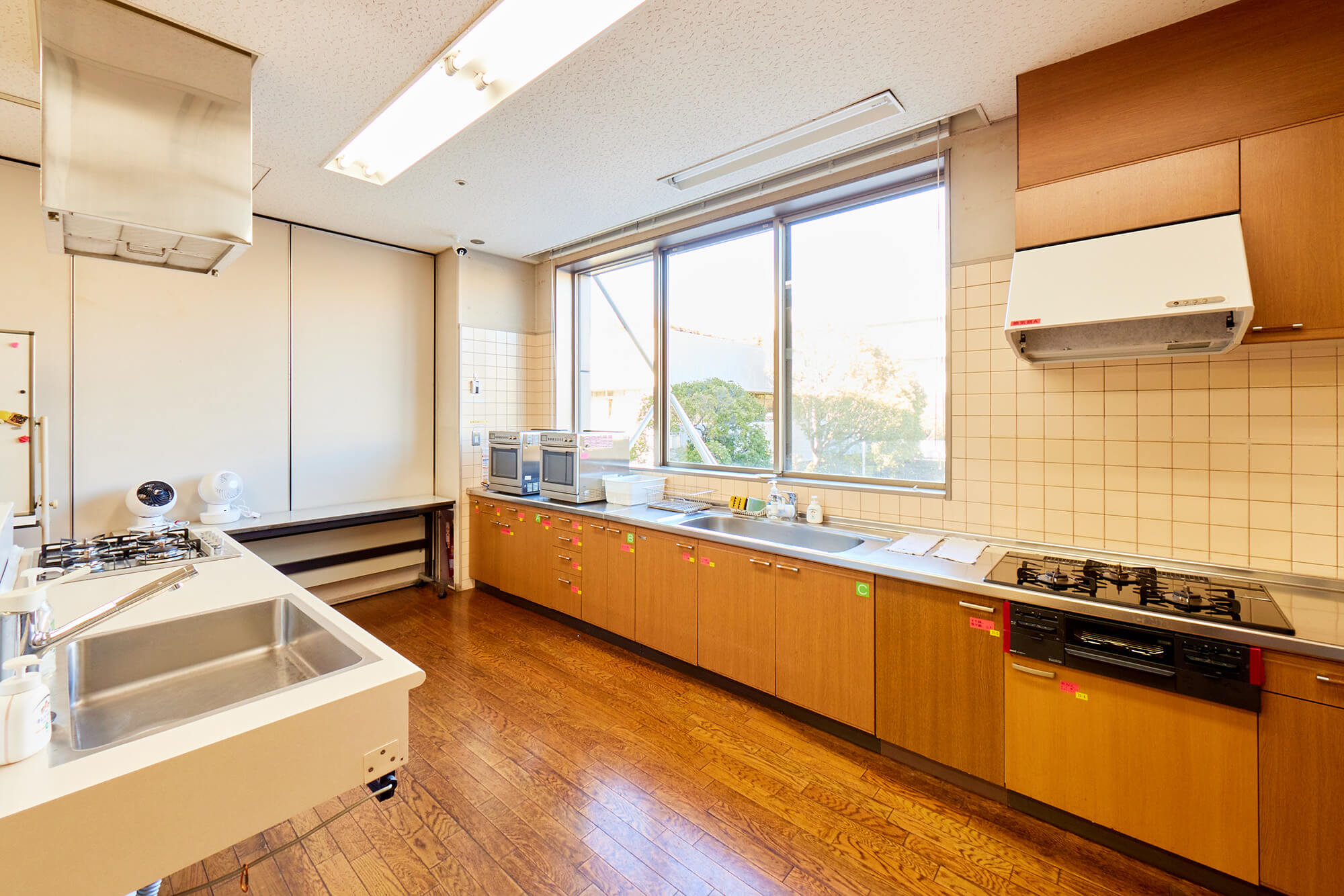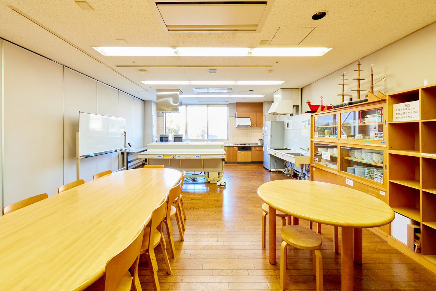 車いすをご利用の方や身体障害のある方も使いやすい、高さ調節できる調理台や使いやすい道具を揃えた調理室です。調理実習やグループでの食事会などに利用できます。